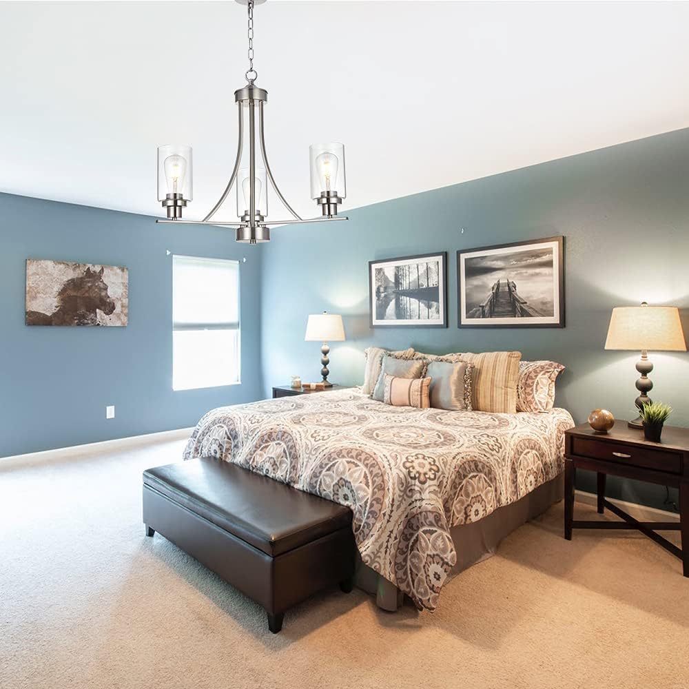 - ๐ 3 Light Modern Glass Chandelier: This rustic kitchen dining room chandelier with high clear glass shades๏ผit is an elegant update for traditional and modern homes alike.It's the perfect light fixture to install in kitchen, island, dining room,living room,foyers ,hallway,bedroom,coffee bar, lobby, restaurant and any space you like.