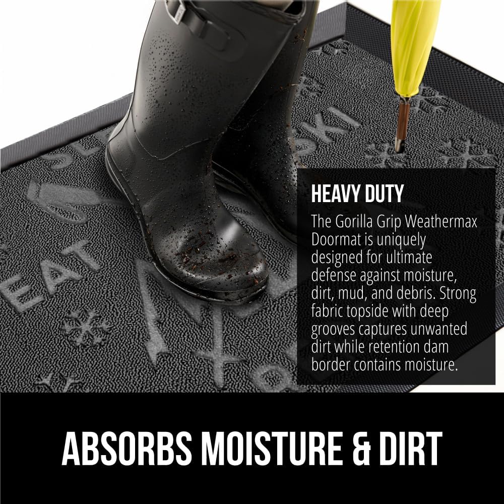 - THE ORIGINAL WEATHERMAX ALL SEASON DOORMAT: Gorilla Grip's Original WeatherMax doormat is built tough with a heavy duty, yet soft and flexible construction; deep grooves, beveled rubber border and retention dam help capture dirt, debris and moisture