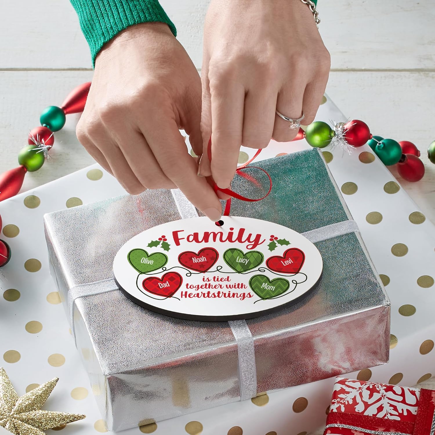 - UNIQUELY PERSONALIZED: Choose Sisters, Friends, Family or Any Title design. Customize your cheery ornament with any 2–6 names up to 12 characters each—letters or numbers. The sentiment "are tied together with Heartstrings" always appears.