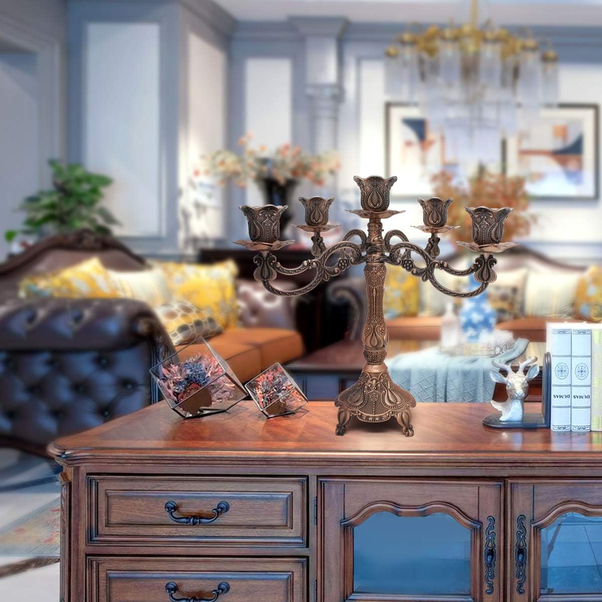 Metal Candelabra 5-Candle 10.1 Inch Tall Candle Holder Stick for Home Wedding Event and Party Festival,Red Bronze