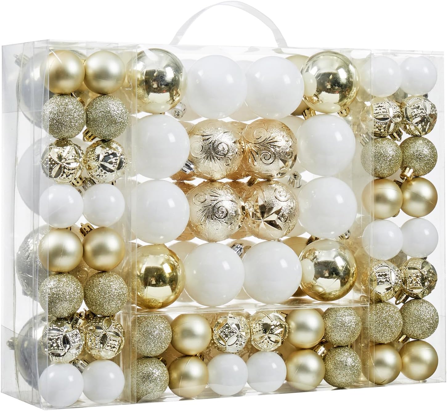 - 87-PACK CHRISTMAS ORNAMENTS - 87 pieces of Christmas ornaments set in a variety of shapes and designs. Hand-held reusable plastic gift box included.These Christmas ball ornaments range in size from 40 mm /1.57" to 80 mm /3.15" in diameter. Perfect fit for any normal size tree.