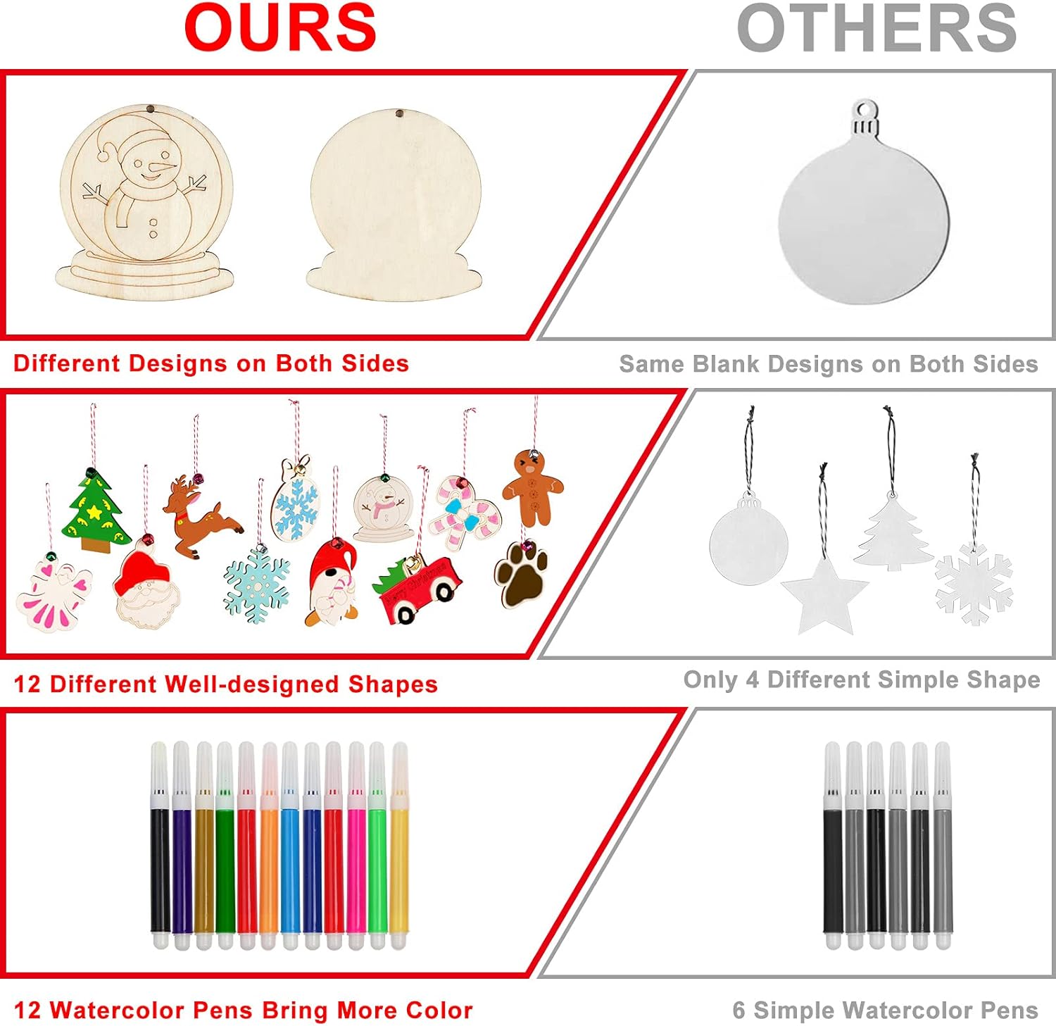 - ❤【Package Included】60pcs wooden Christmas hanging ornaments in total, which is 12 patterns (truck / gnome / dog paw / angel / gingerbread man / candy cane / moose / Christmas tree / old man / snowman / snowflake / round snowflake ), 5 of each, 16m of red rope, 60 colored bells, 12 colored pens, color box packaging and an A4 instructions, rich enough to decorate the Christmas tree ornaments