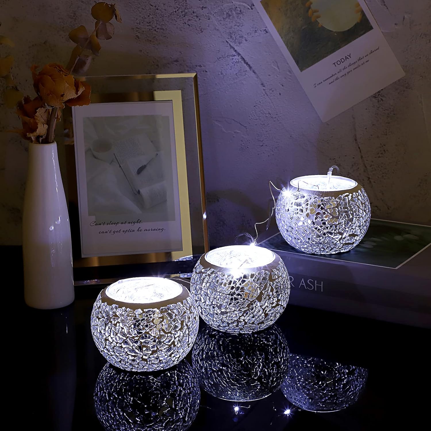 OwnMy 3PCS Mosaic Glass Tea Light Holders Round Bowl Votive Candle Holders Pillar Candle Stands, Silver Glass Mosaic Tealight Holders Potted Plant Bowl Vase Candle Centerpiece for Dining Table Wedding