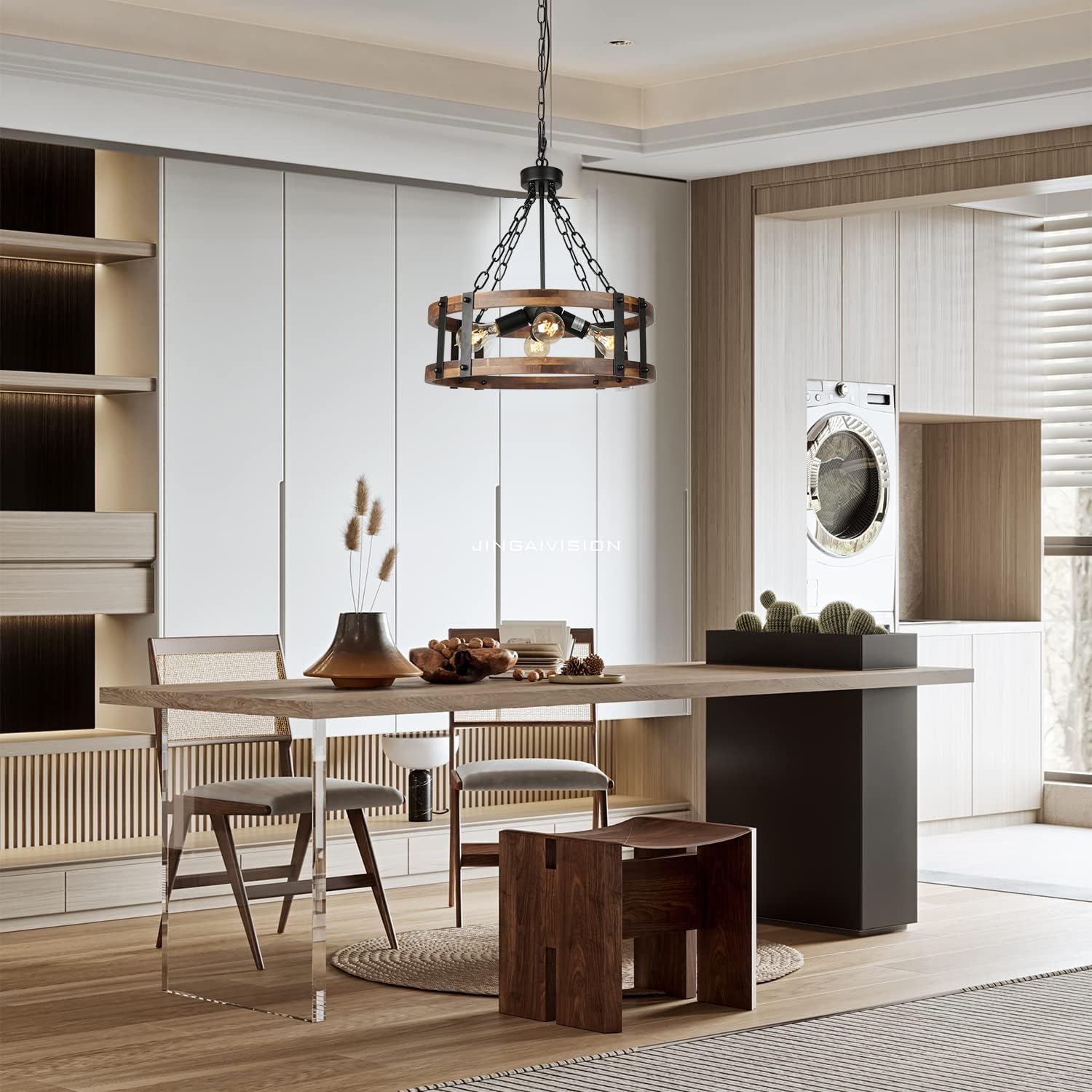 - [Rustic Farmhouse Chandelier]: Made of premium natural wood and matte black metal. This 4-light drum chandelier is inspired by modern farmhouse accents and barn designs, offering distinct charm to your home, will add a farmhouse aesthetic ambiance to your space.