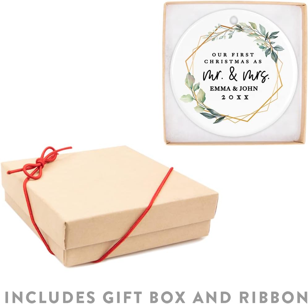 Andaz Press Personalized Our First Christmas As Mr. & Mrs. 2025 Christmas Ornaments Geometric Greenery 2.8" Round Porcelain Ceramic 1st Year Married Custom Ornament for Newlyweds Keepsake 1-Pack