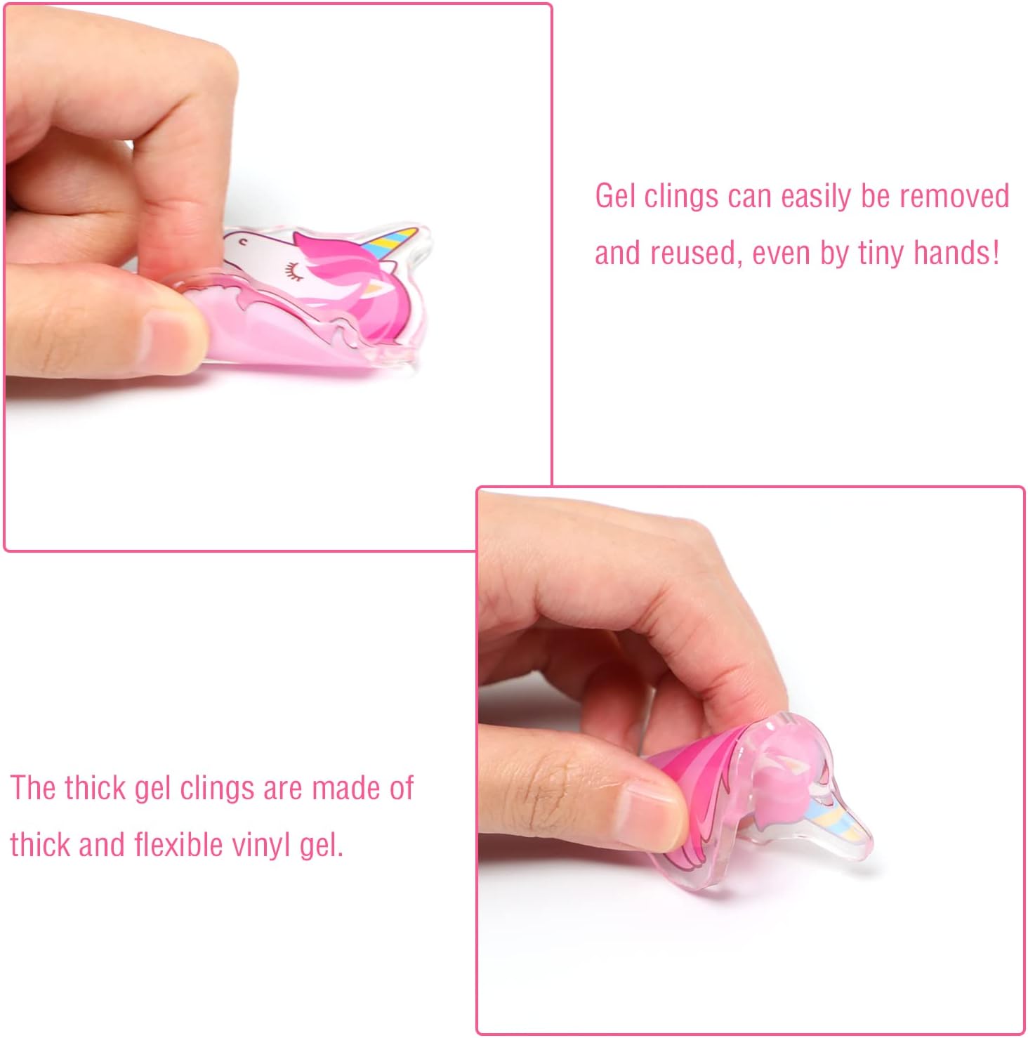 - Easy to use: just peel off the unicorn thick gel clings from the plastic backing, then place it on any surface you want; if you want to rearrange it, just tear it off and move it.