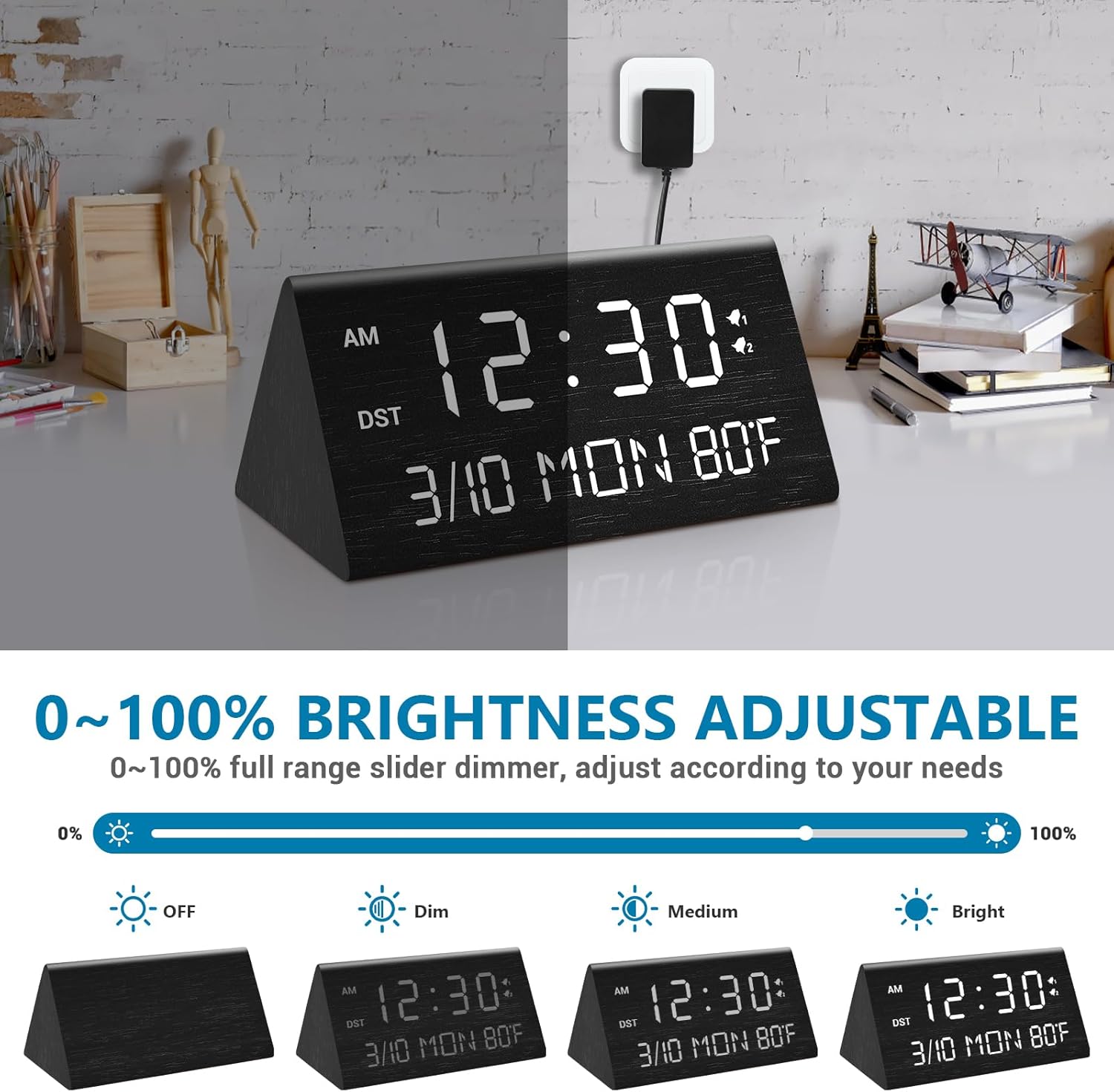 - â°ă5 Level Brightness Adjustable alarm clockă- Compared with the alarm clocks on the market that only have three levels of brightness adjustment, this wooden alarm clock is upgraded to 5-level dimming. Customers can adjust the brightness to 5 percentileïŒ0, 20%, 40%, 60%, 80%, 100%ïŒ, which solves the problem of too bright display at night and helps you fall asleep better.