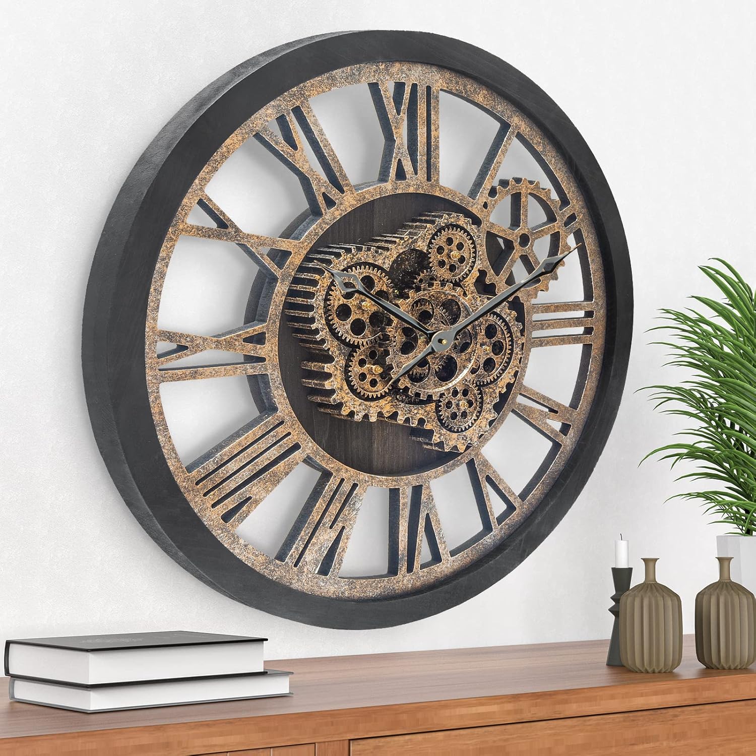 - ăReal Moving Gear ClockăAll gears for the wall clock are real moving! Design with rustic bronze-color and industrial style. An creative combination of four gears for a retro look, has a very exquisite decorative effect makes the wall clock become a chic art works. The large wall clock crafted of nature wood & MDF. Big roman numeral numbers and wood rustic moving gears perfect for any room decor.