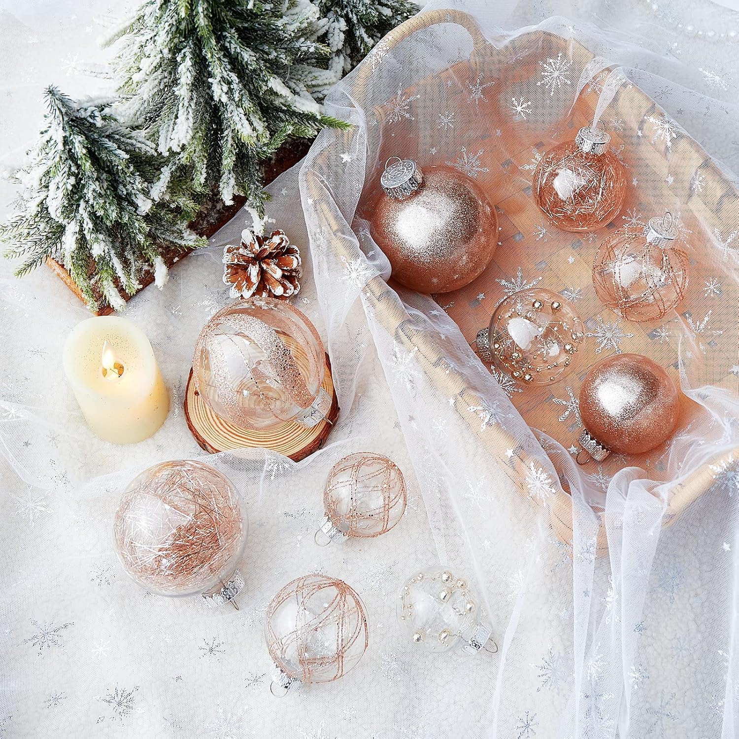 - Rose Gold Christmas Ball Ornaments--These 24 clear Christmas decorations are made of durable and environmentally friendly plastic with excellent shatter resistance. These Christmas balls have shiny decorations and a transparent glaze base, which are perfect for hanging on your Xmas tree and decorating your Home with them,this will become part of your vacation.