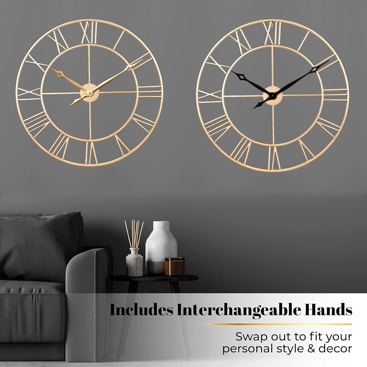 - [Easy to Read and Hang]-30" (75cm) Oversized large Roman numerals in contrast with aluminum large hands for easily reading. Simple design with a good performance. Package Comes with 1 set extra color interchangeable Clock HandsïŒalso included Invisible Nail Hangers for hanging