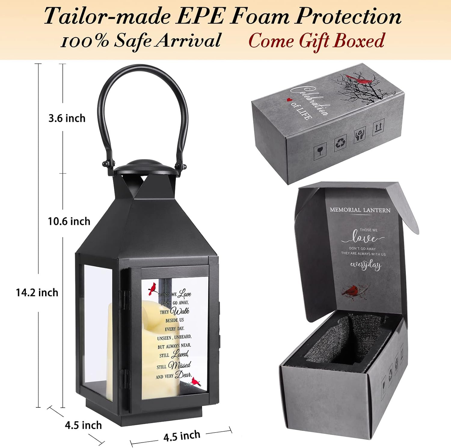 - BEAUTIFUL MEMORIAL GIFT: This black metal memorial lantern with flickering LED candle and sentimental verses is a great sympathy gift for loss of mom/dad/loved one. For those who are struggling with grieving, it brings a lot of peace. The lantern's warm glow in the evening may comfort the receiver and give him/her a sense that the loved one is there watching over him/her. The cardinal on the gift box and the front glass gives us a feeling of someone we love being near. β€οΈ