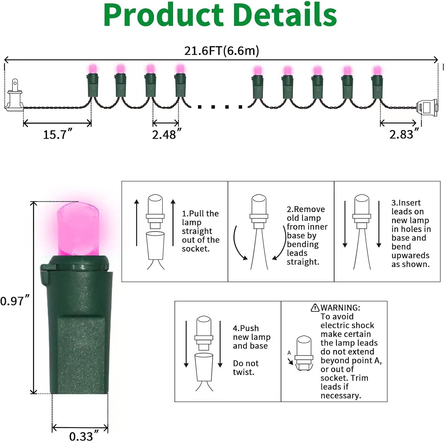 - 5mm LED Christmas Lights: 100 counts warm white 5mm wide angle stable LED string lights spaced 6.3 inches apart with green wire. 7.1 inch leads have a stackable male plug and 5.9 inch tails have a female plug for easy end to end connection.