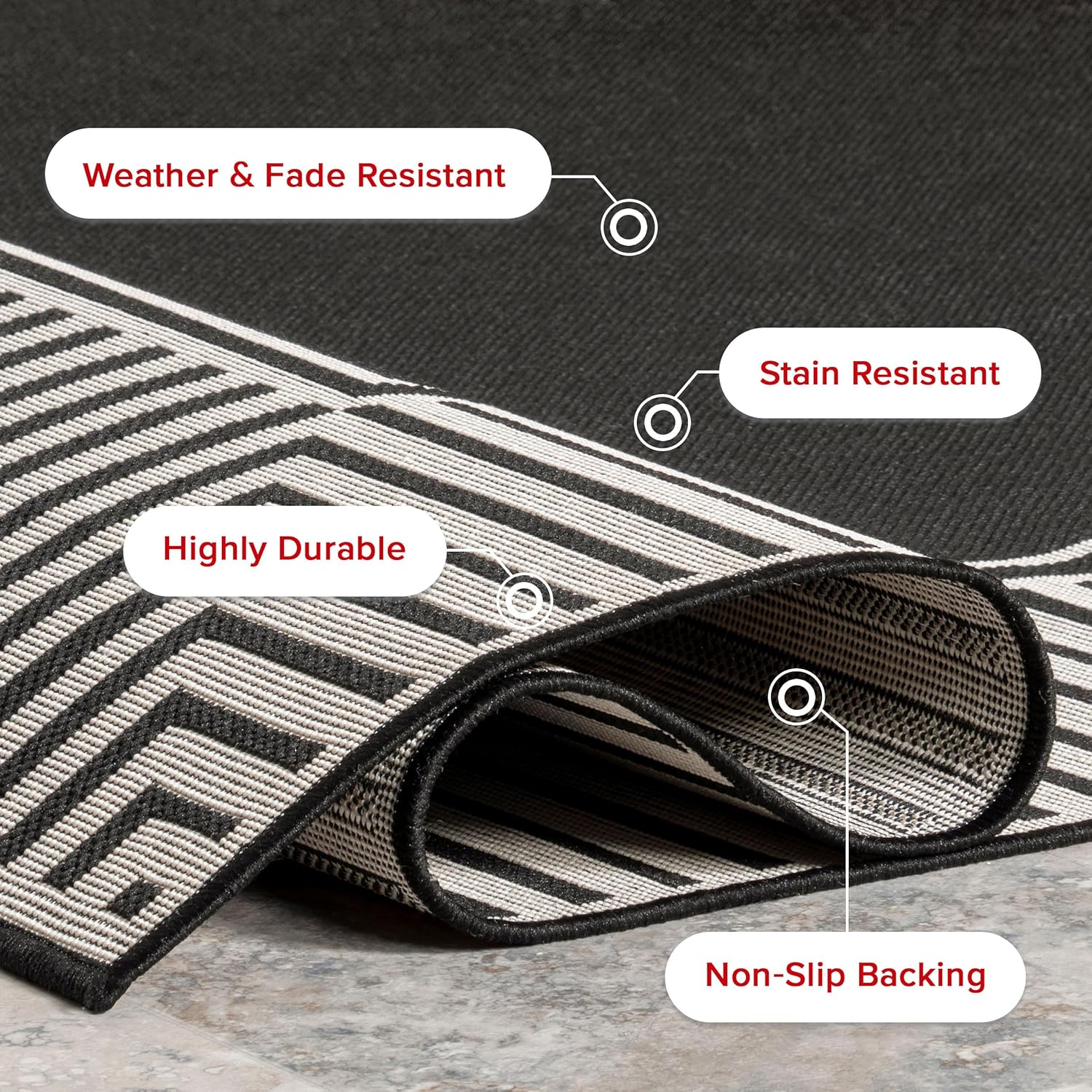 - Weather and Stain-Resistant: Keep your indoor/outdoor rug looking pristine effortlessly. Its stain-resistant properties make cleaning your area rug a breeze, allowing you to maintain its beauty. This area rug is a great choice for outdoor spaces.