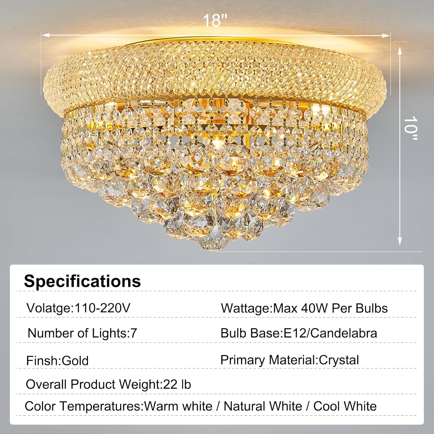 - FIXTURE DIMENSIONS:The dimension of Crystal Chandelier is Height 10 inch, Width 18 inch.