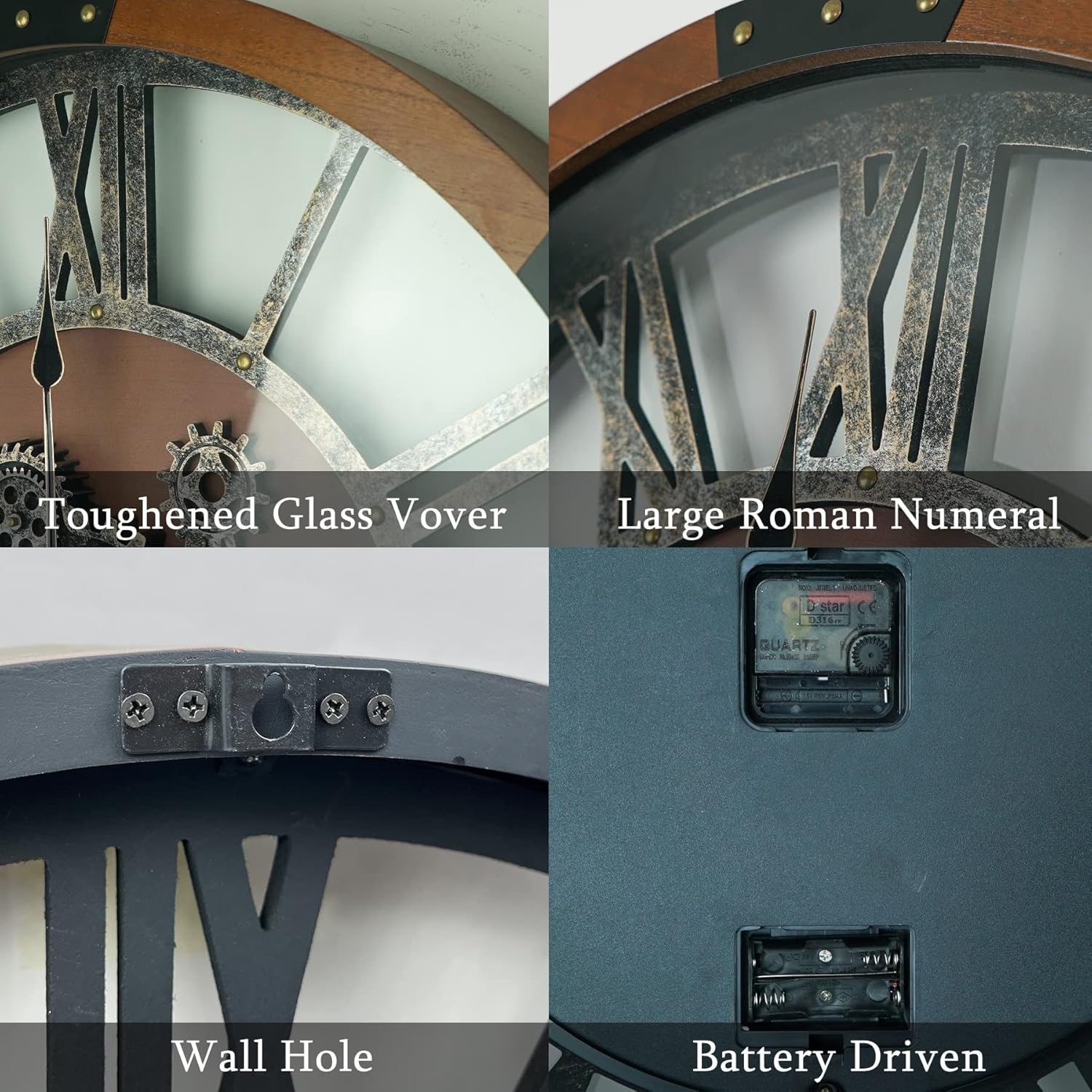 - 🕞Real Rotating Gears: The exposed gears on this large wall clock are real and rotate independently of the pointers. With a dust proof glass cover and battery powered operation, the gears rotate almost silently, providing a unique and dynamic way to experience time.