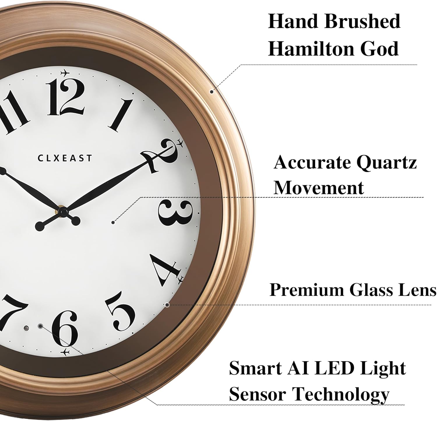 - [Indoor/Outdoor Wall Clock with Smart AI Light Sensor]-This unique 18" large ABS plastic wall clock is with integrated light sensor that automatically activates a warm, ambient full dial backlight during dark conditions,shuts off in normal daylight.An elegant timepiece for your living room home decor or outdoor garden,pool, patio,porch or backyard under covered area only, make sure the wall clock is away from exposed elements like heat, cold and rain.