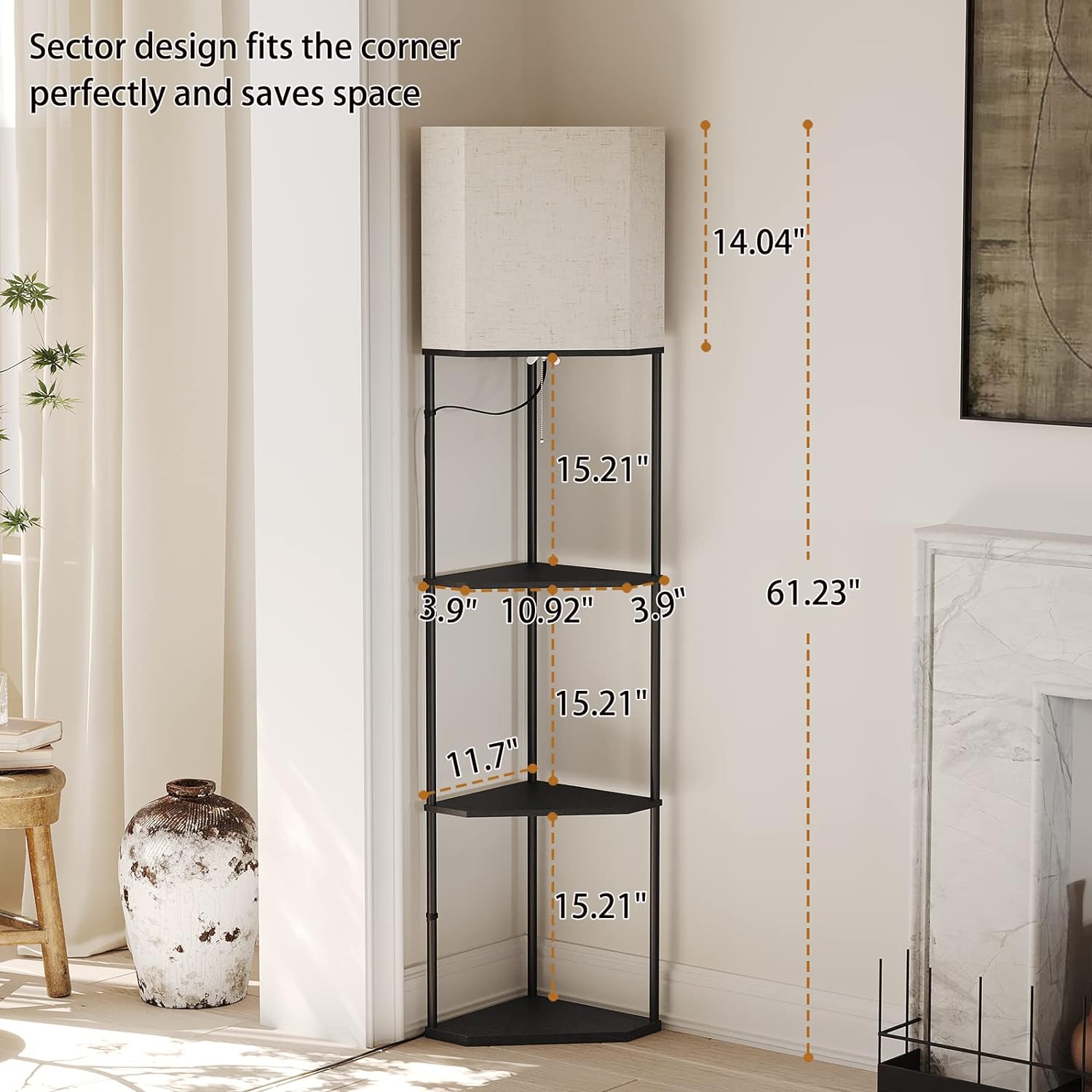 SUNMORY Sector Corner Shelf Lamp 3 Color Temperatures LED Bulb,Corner Lamps with Linen Lampshade, Floor Lamps for Living Room, Bedroom, Study, Black Standing Lamp with Shelves