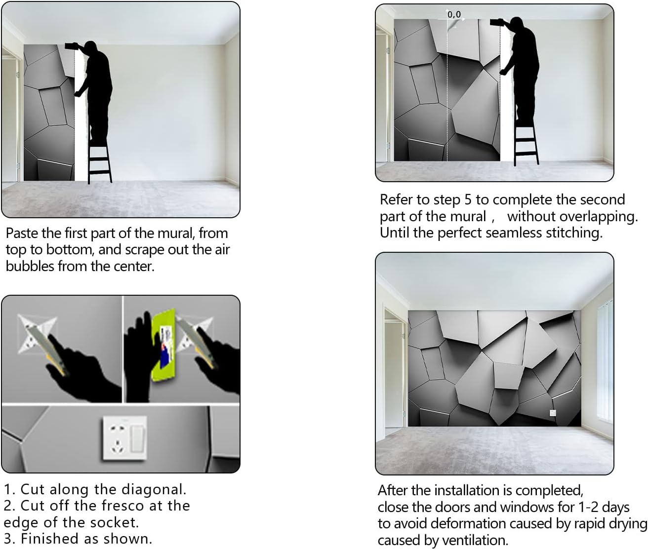 - It's easy to install: at the bottom of each mural we have a numbered sequence, You can refer to the instructions we provided and the main picture 6-7,just match the numbers and you'll be amazed!