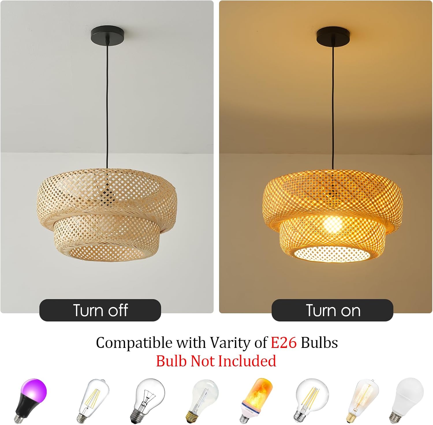- 【 Easy installation】Bamboo and Rattan pendant light all mounting hardwares are included and installation process is simple, which just need 5 minutures. open the package when installing the lampshade please gently open the folding lampshade, mounted to the metal bracket, connect to the power supply, press the switch button to turn on or off the light.If you need to find seller support