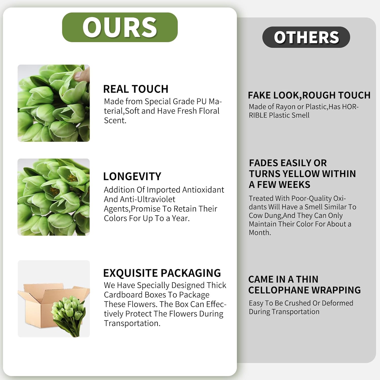 - What sets our tulips apart is their longevity. With the addition of imported antioxidant and anti-ultraviolet agents, these tulips promise to retain their colors for up to a year, ensuring lasting beauty in any environmental condition. Note: Artificial flowers without UV inhibitors will turn yellow within 2 weeks under sunlight, and those treated with poor-quality oxidants will have a smell similar to cow dung or burning plastic , and they can only maintain their color for about a month.