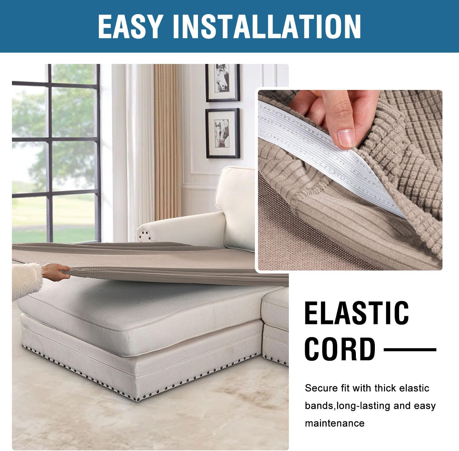 - NON SLIP: Effortless for installation (guide photos on selling page), sewn with thick elastic loops to cover the bottom edges. It is easy to install and take off, making your home more harmony, high recommended for both leather and cloth furniture