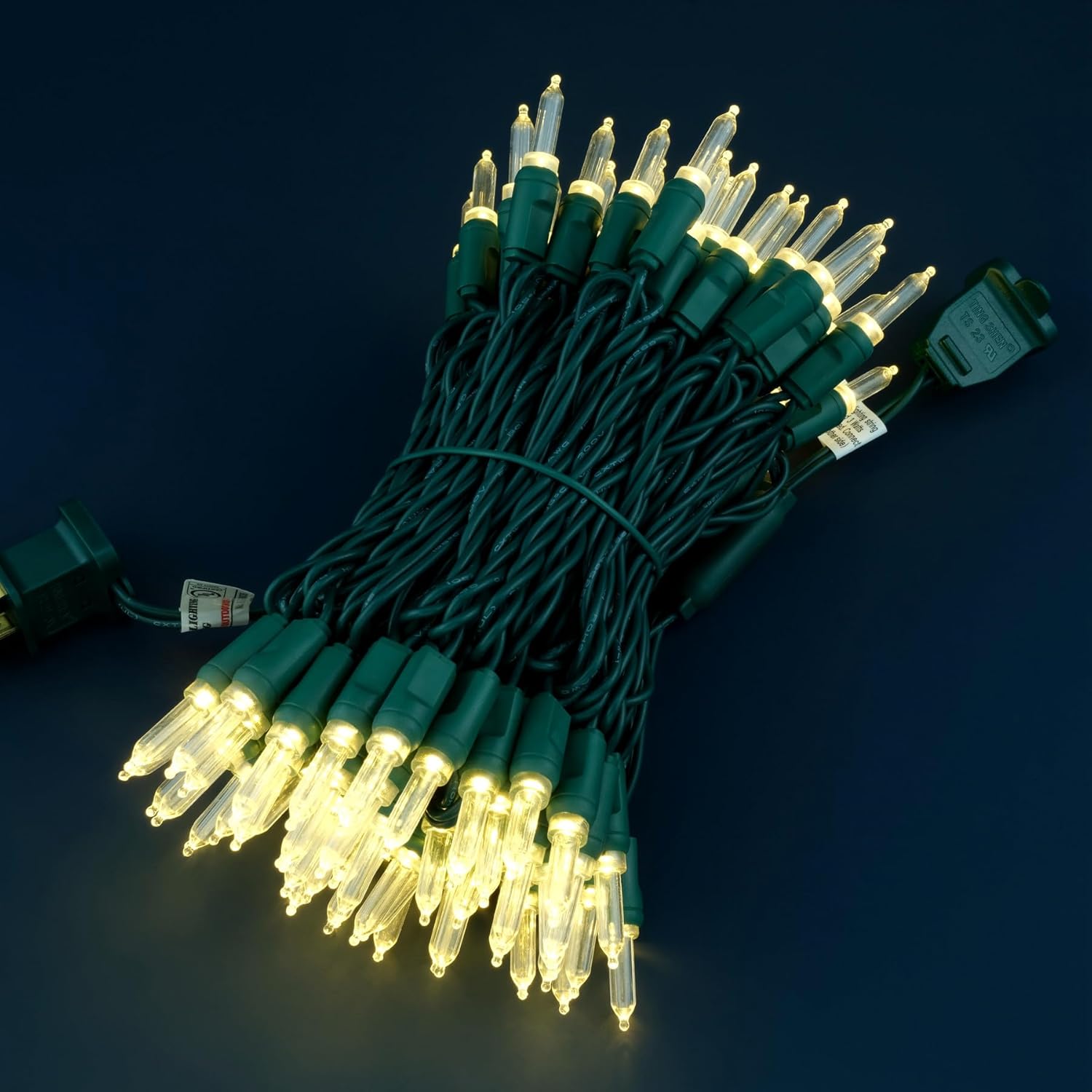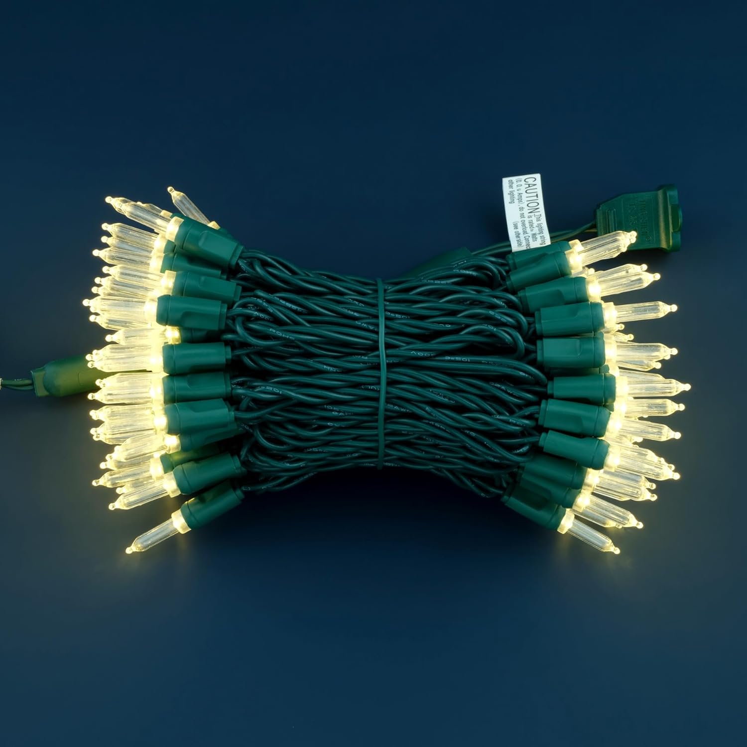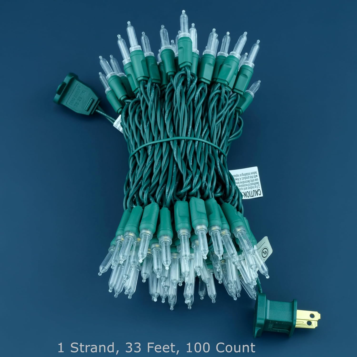 - SPECIFICATIONS β Each pack contains 1 strands of one-piece string lights, total length 33 feet with 100 count warm white mini lights. 22 AWG green cord, 4" lead, 4" spacing, 4" tail.