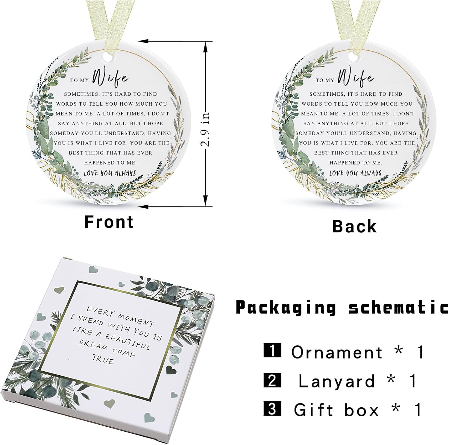 - 🌼【Perfect and delicate size】This is a wife memory ornament with a diameter of 2.9 inches and a thickness of only 0.18 inches. The product includes: a round wife ornamentt*1, a gift box*1 and a lanyard*1. The gift box comes with it makes it easy for you to give the best wife ever gifts directly to family and friends and other special people in your life, and the lanyard that comes with it helps to hang it easily on the Christmas tree or anywhere you want.