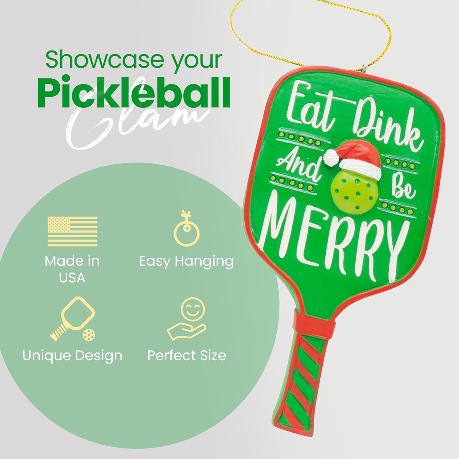 - Festive Pickleball Design – Features a bright green pickleball paddle with the playful phrase “Eat Dink and Be Merry” and a Santa hat accent.