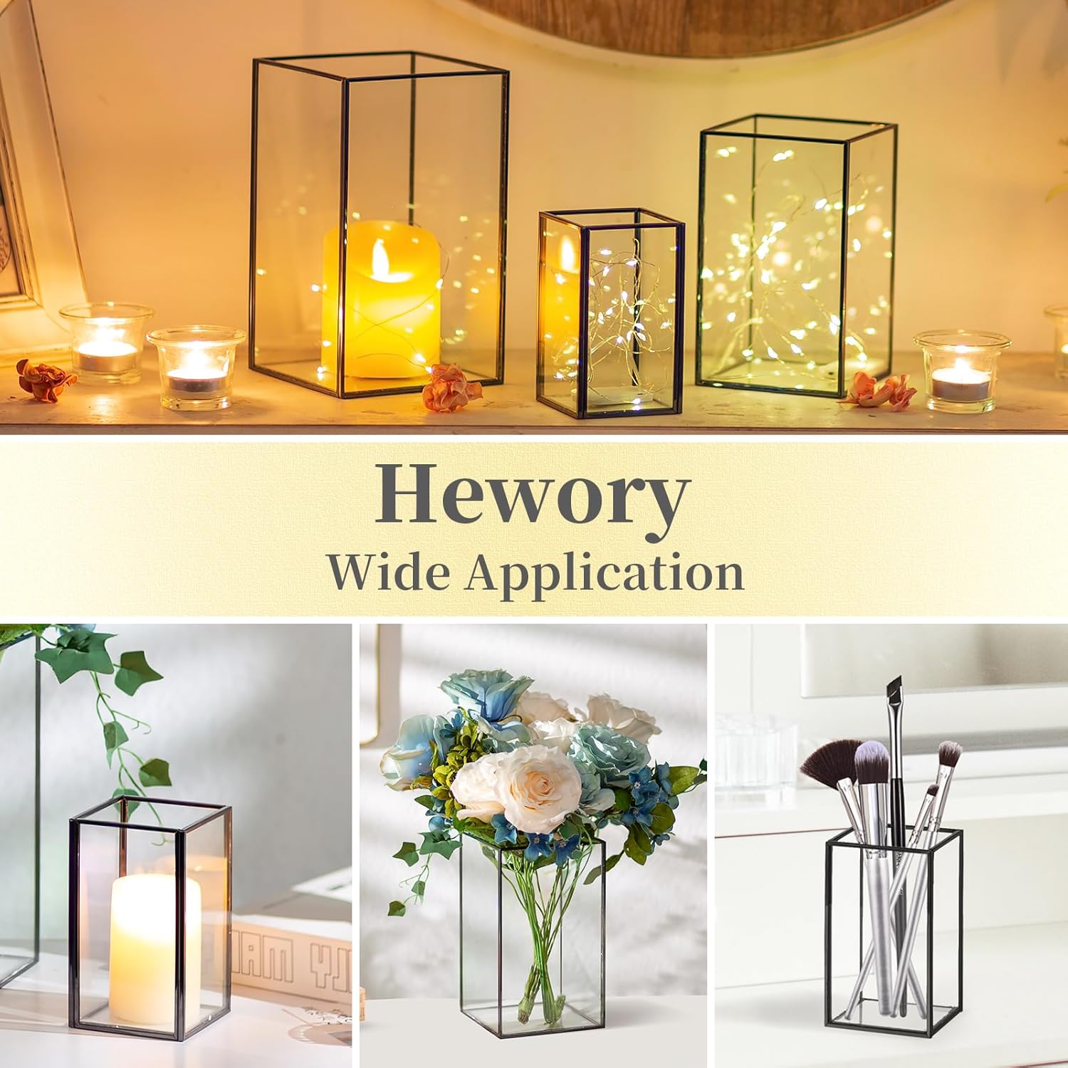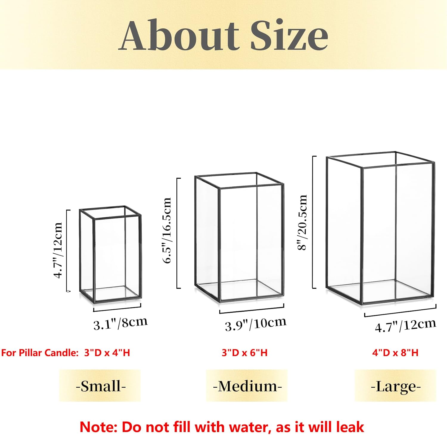 - 3 Different Sizes -- The square candle holders are 3 different sizes, which is so much more interesting to look at. They can meet your different needs. It can not only hold pillar candles, electronic candles or tea light candles, etc., but also some dried flowers, colored stones, fairy lights, makeup brushes or pencils.