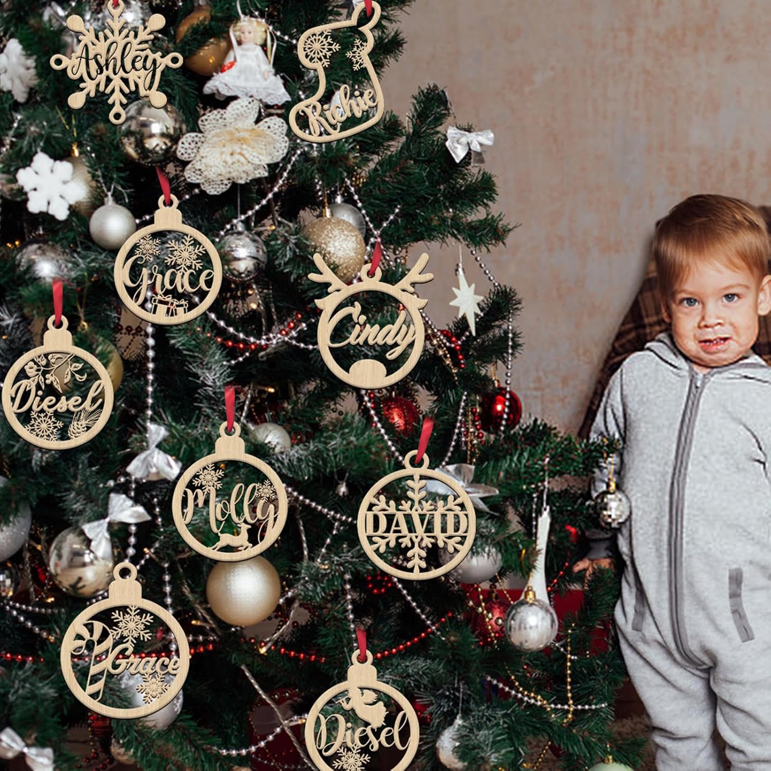 - HIGH QUALITY: Our personalized Christmas ornaments are made of high-quality wooden materials, durable, light, and high-quality. Ornament includes a red ribbon for hanging.