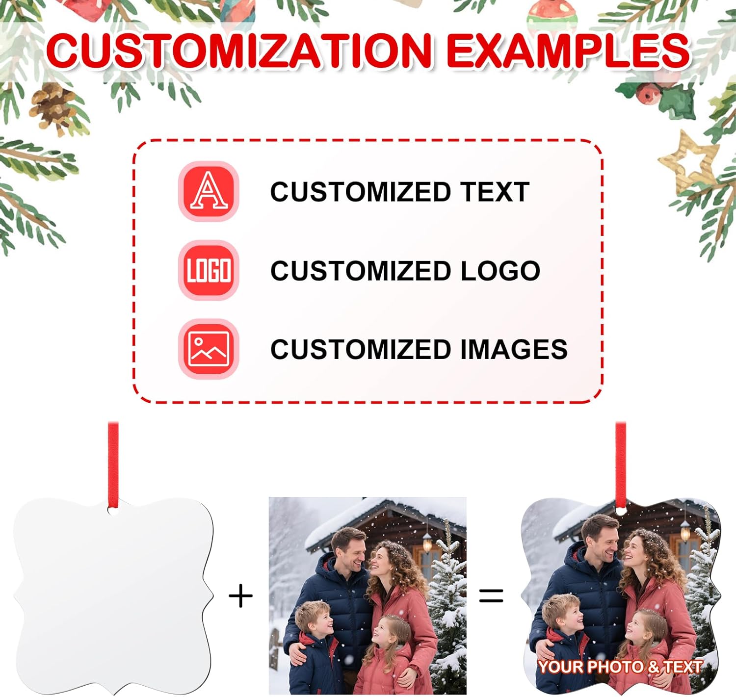 - CUSTOM CHRISTMAS ORNAMENTS 2024 - Click "Customize Now" to start personalize your own ornament special with desired photo, words, text, logo, image, saying, number, name etc. You can customize several ornaments to send to all your loved ones. Imagine how surprised they will be when they receive the personalized gifts.