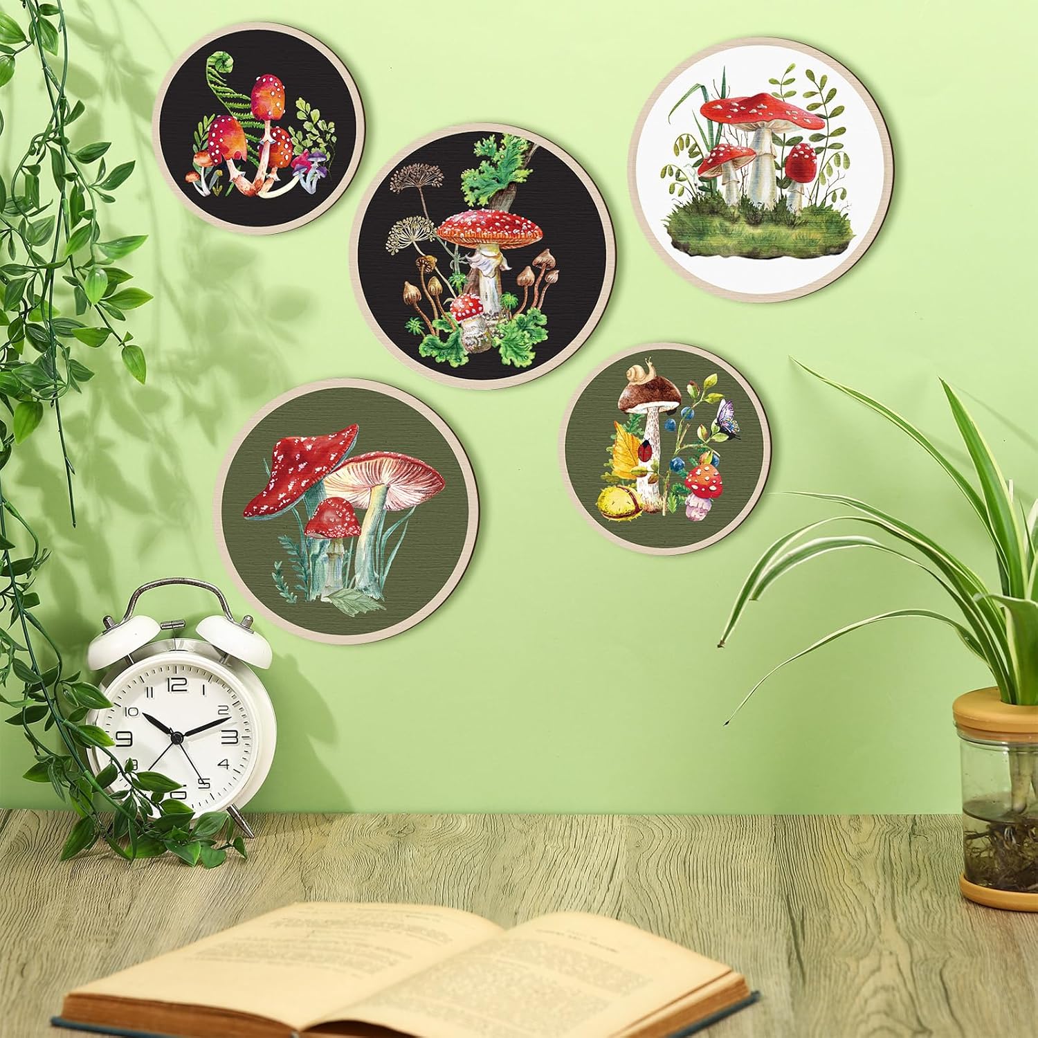 Qunclay 5 Pcs Wall Art Decor Wooden Living Room Wall Decor Bohemian Hanging Farmhouse Geometric 10'' and 8'' Aesthetic Wood Minimalist Posters for Bedroom(Mushroom)