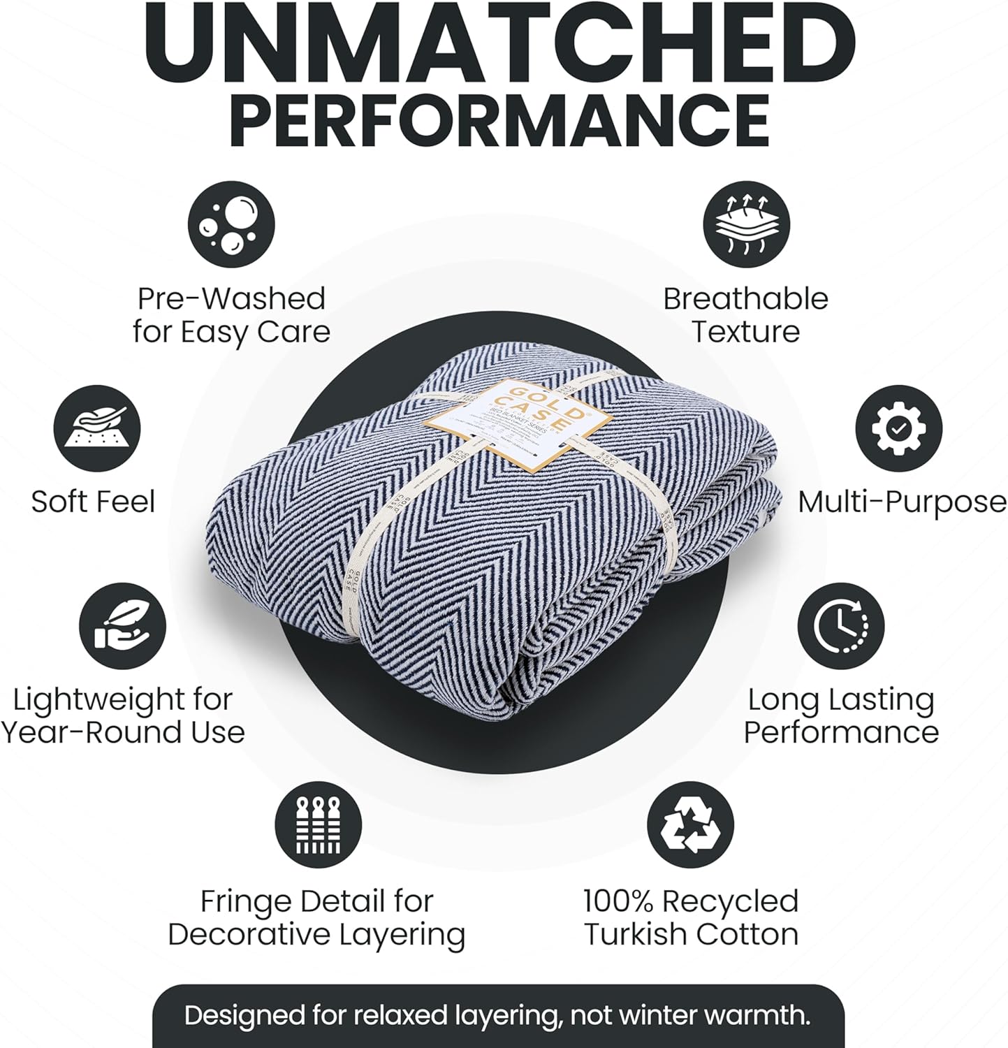 Gold Case Throw Blanket for Bed – 100% Recycled Turkish Cotton Bed Blanket – Decorative Throw Cotton Blankets for Living Room & Bedroom – Elegant Navy Blue Woven Queen Blankets – 90x90