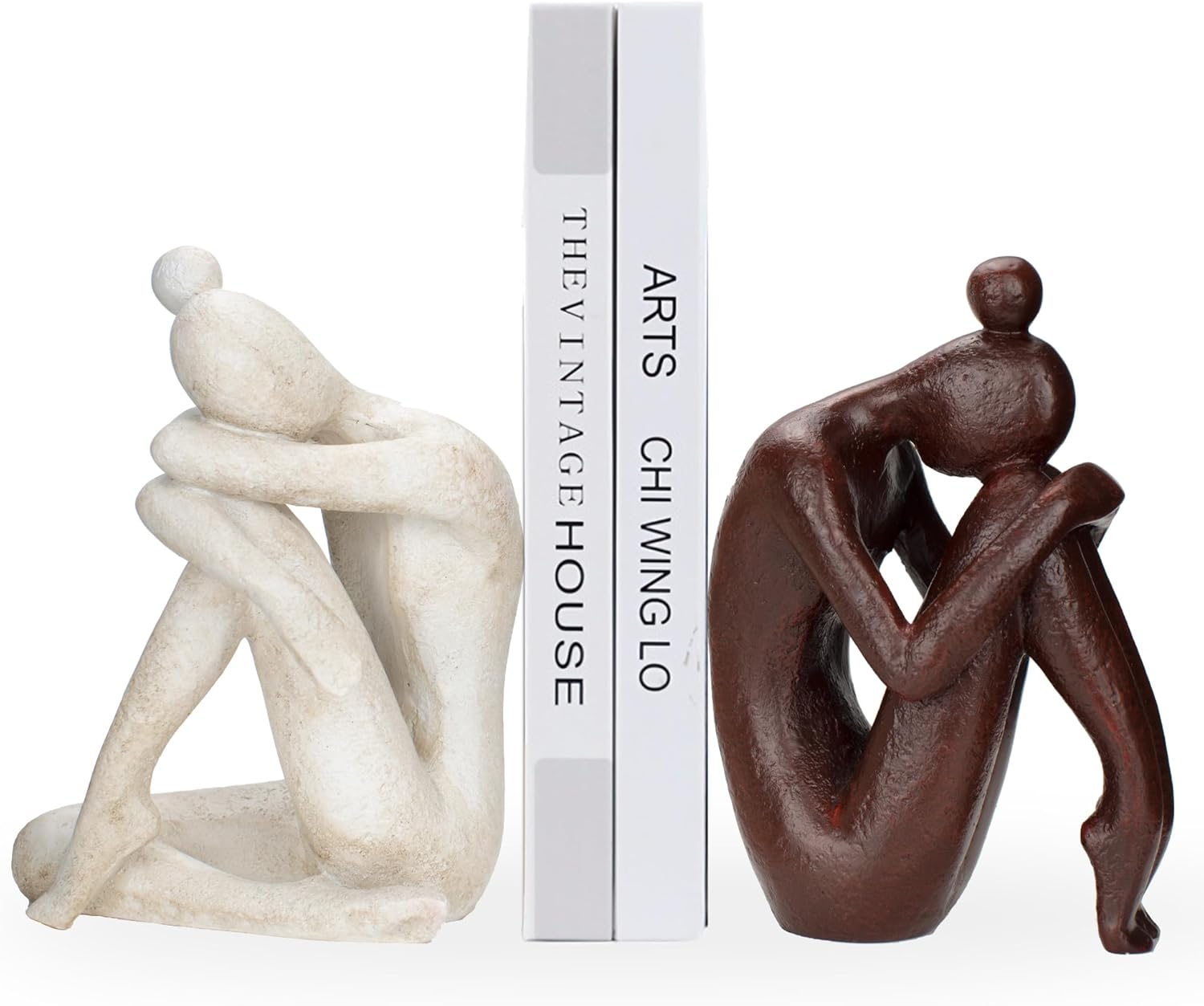 Decorative Bookends for Shelves, Unique Book Ends for Home Office Decor, Meditation Girl Statue Book Stopper for Bookshelf Decor, Modern Abstract Aesthetic Decoration White & Brown