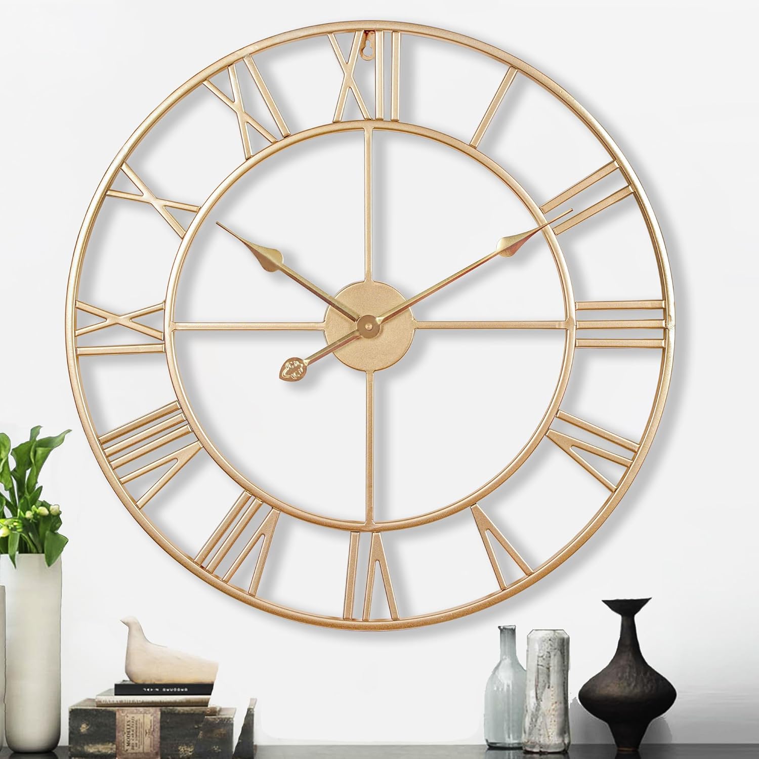 CLXEAST Champagne Gold Metal Wall Clock, Large Roman Numeral 24 Inch Wall Clocks for Living Room Decor,House Warming Gifts New Home