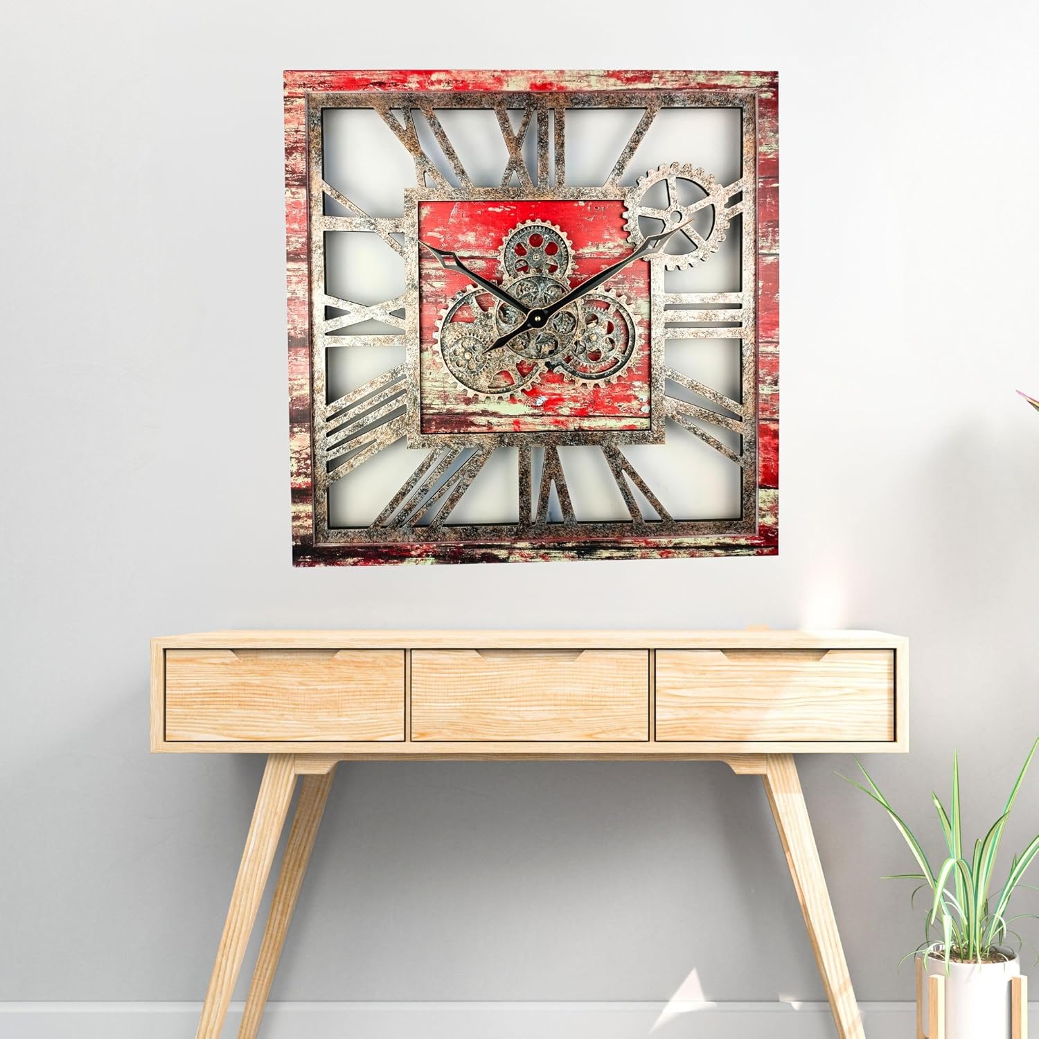 The Gears Clock 24'' Inch Square Real Moving Gear Wall Clock Vintage Industrial Oversized Rustic Farmhouse (Red Lava)
