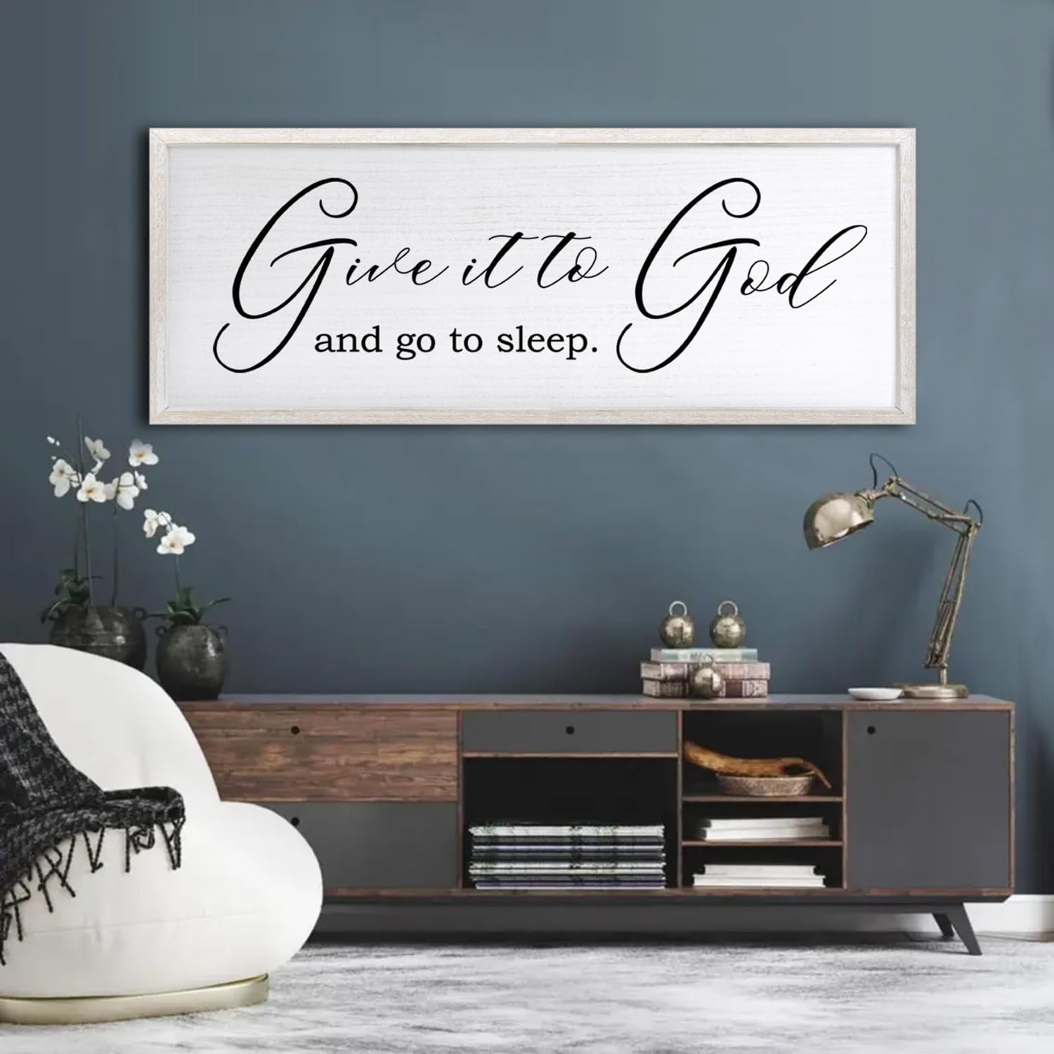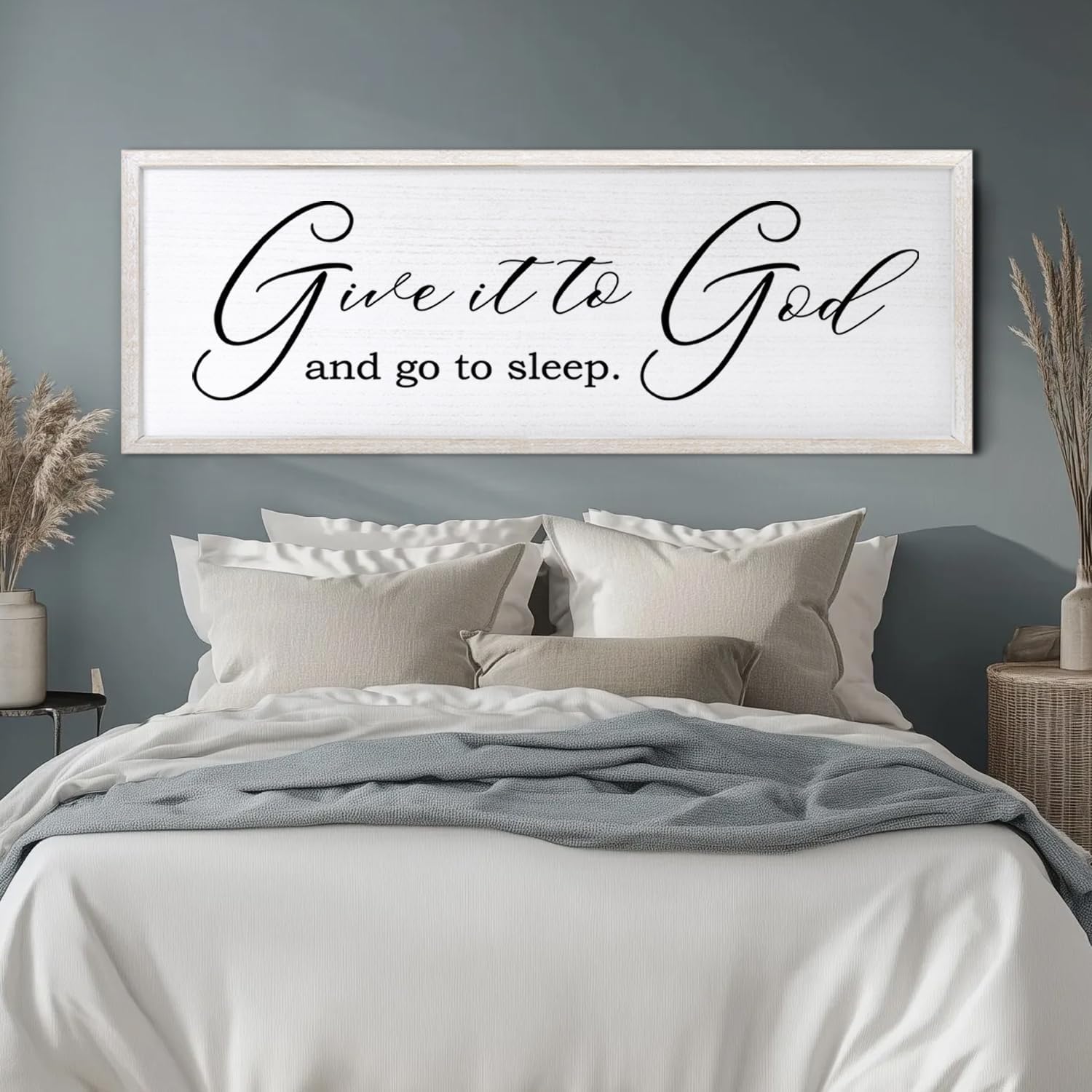Give It To God And Go To Sleep Sign Wall Decor 40x15 Inch Large Farmhouse Master Bedroom Above Bed Hanging Wall Art Rustic Guest Room Wood Framed Over Bed Wall Decoration (White)