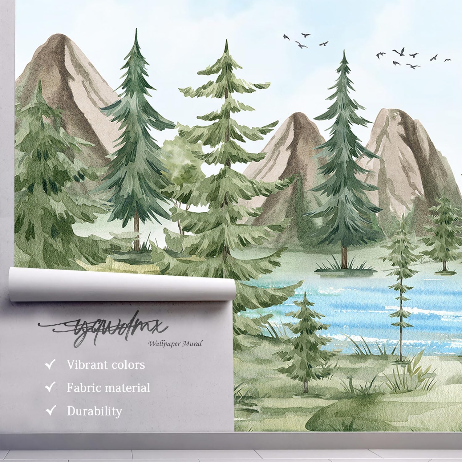 -Watercolor Green Pine Mural Cartoon Forest Fabric Wallpaper Children's Room 140" x 91"(Not Peel and Stick)