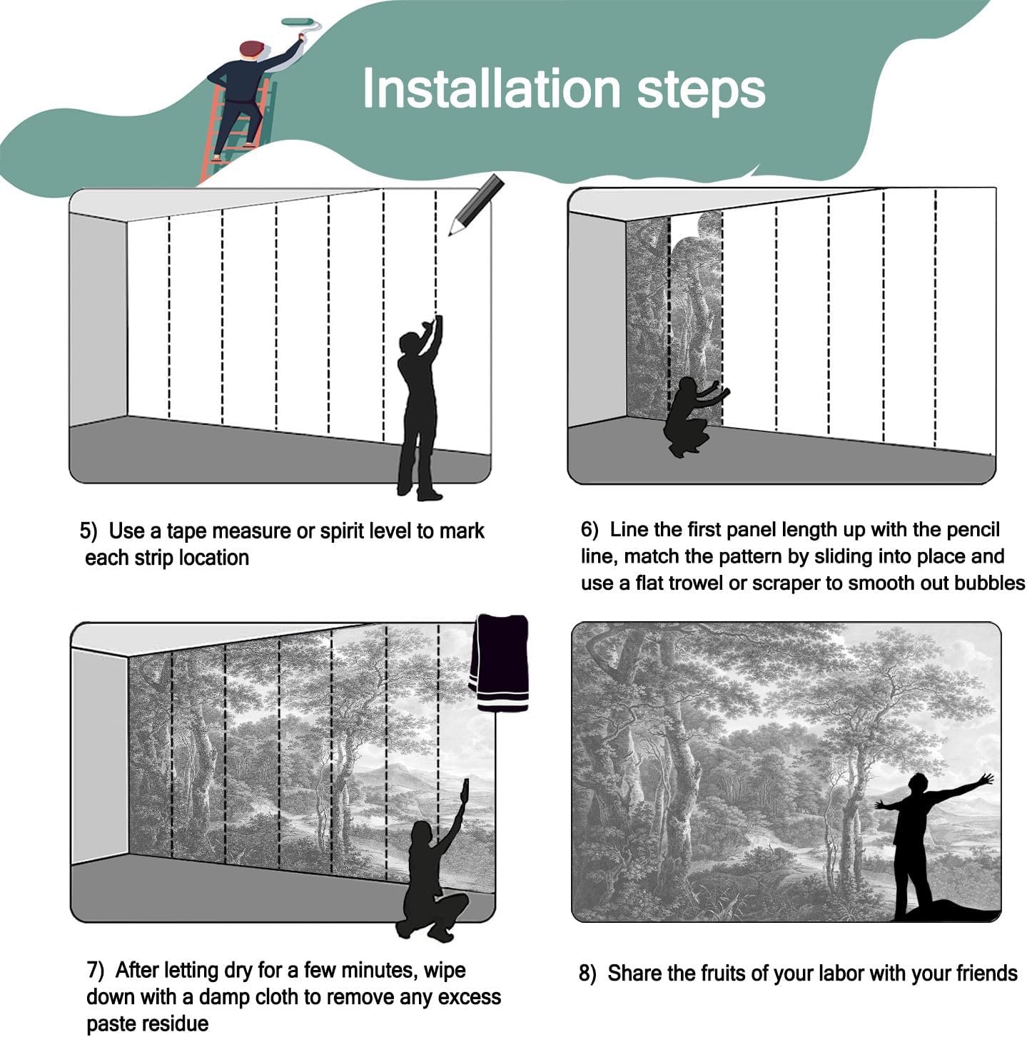 - Mural wallpaper size: 100 "W x 65 "H, divided into 5 sections, each section is labeled with a number underneath, there is no need to overlap the pattern when installing, just install according to the number labeled underneath the panel