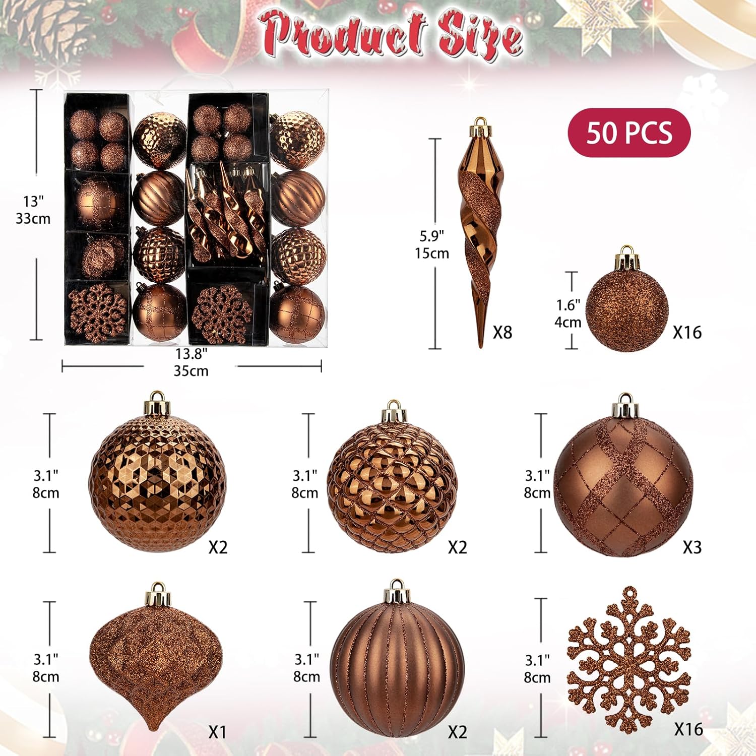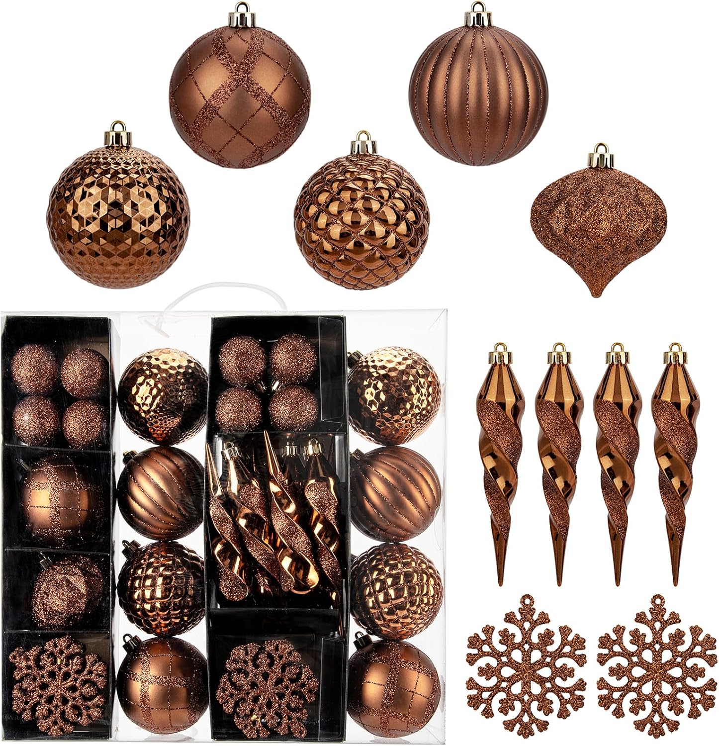 50PCS Christmas Tree Ornaments Set with Shatterproof Christmas Balls Icicle Snowflake Hanging Ornaments for Home Office Farmhouse Christmas Decorations, Bronze