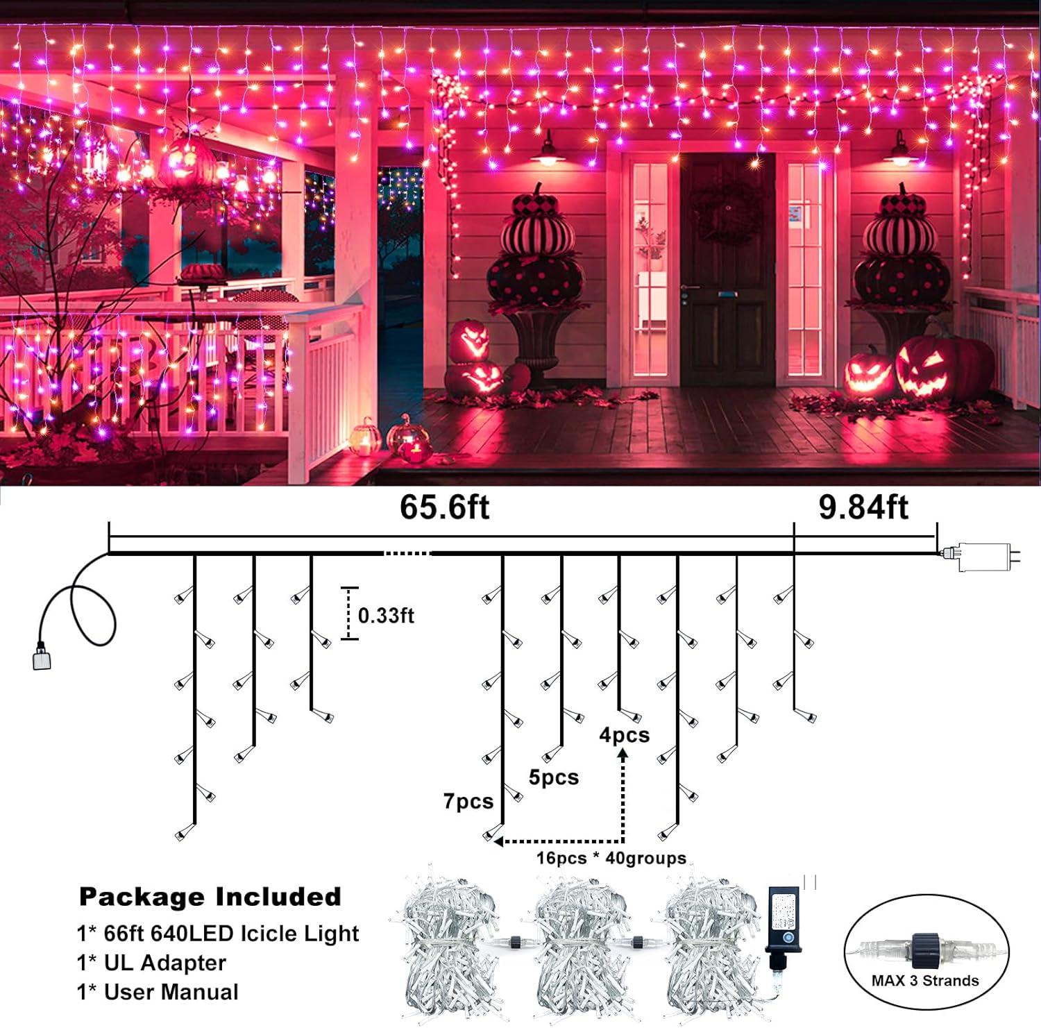 - Upgraded Halloween lights: These Icicle lights for outside have 640 LEDs with 120 hanging drops with 4, 5, 7 LED drops, 66 feet total length. The 10ft cable length can easily reach spaces like your bedroom and yard. Additionally, you can press and hold the round button on the adapter to choose 8 different lighting modes, including combination, in waves, sequential, slo-glo, chasing/flash, slow fade, twinkle/flash and steady on.