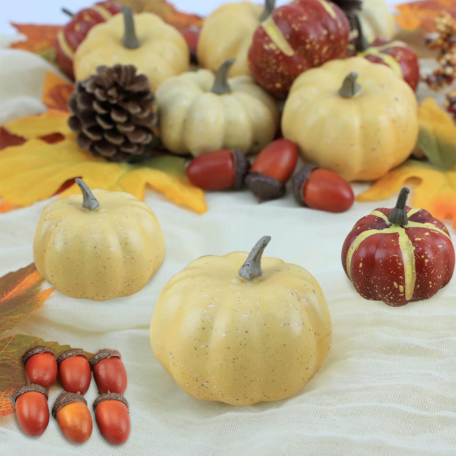 23Pcs Fake Pumpkins Fall Thanksgiving Decorations,Plastic Pumpkins with Acorns,Maple Leaves,Pine cones,Berries, Artificial Mini Pumpkin Decorating Harvest Home Decor Centerpiece Table Decorations