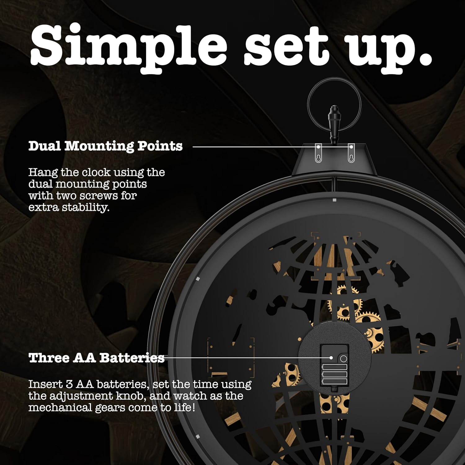 - SIMPLE SET-UP: Insert 3 AA batteries (not included) and set the time using the adjustment knob on the back. Hang the clock using the dual mounting points with two screws for extra stability.