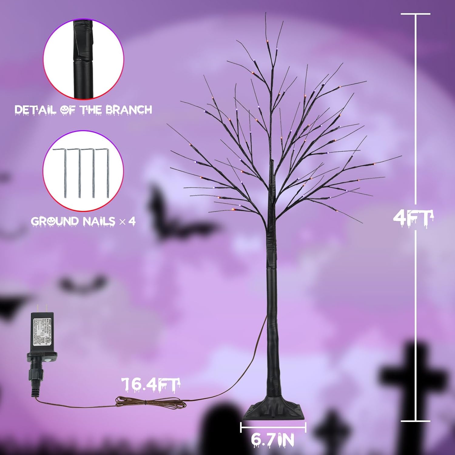 - Black Halloween Tree Lights: Total height of 4 FT with a 7.87 in* 7.87 in base, each 50 LED Purple&Orange lights, lifelike shape, flexible branches,commonly use for Halloween decoration and create a spooky and scary atmosphere.