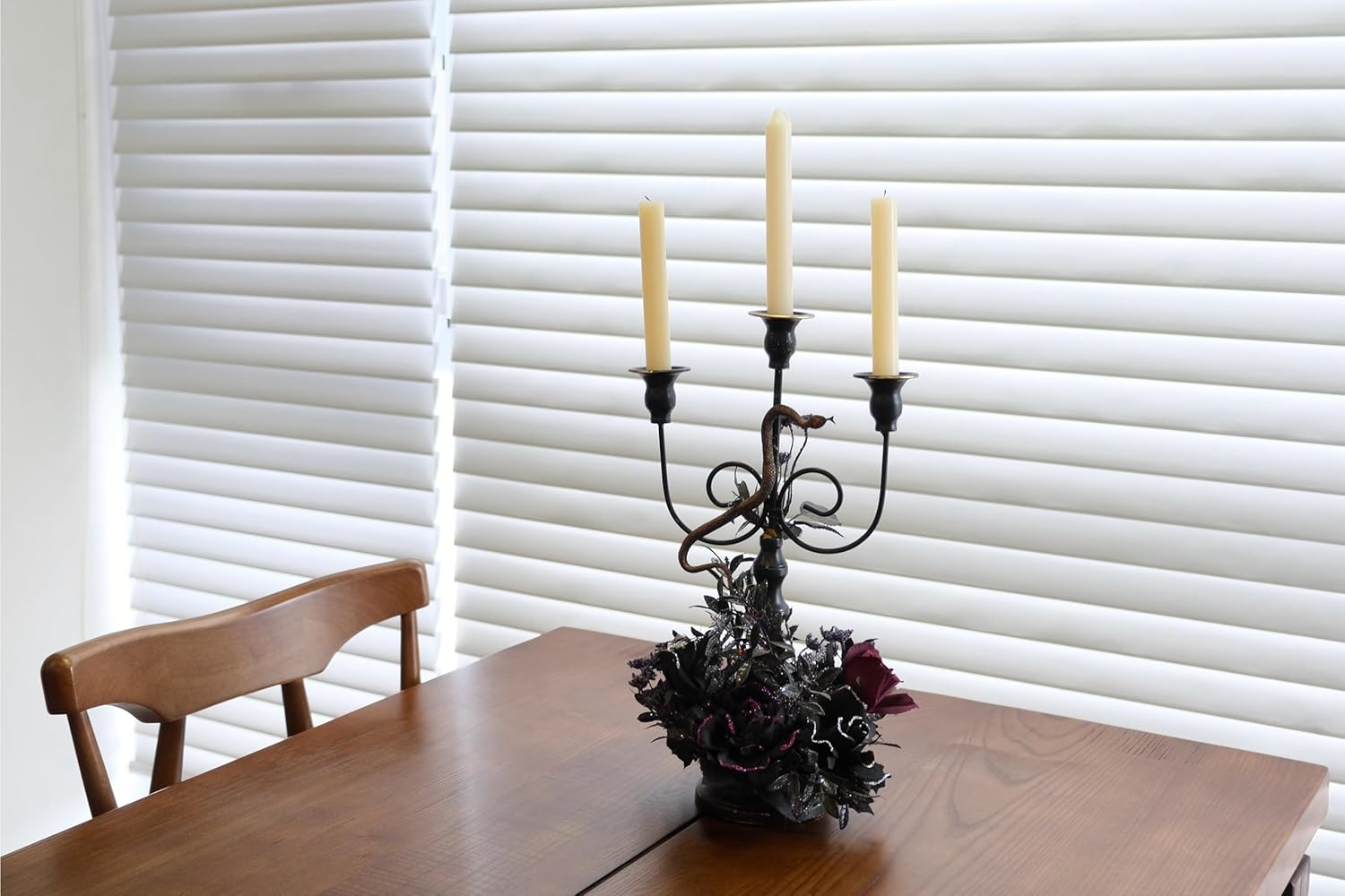- Elegant and Spooky Design: This black metal 3-arm candelabra, adorned with high-quality artificial flowers, leaves, and a small snake, is perfect for Gothic home decor or as a Halloween table centerpiece