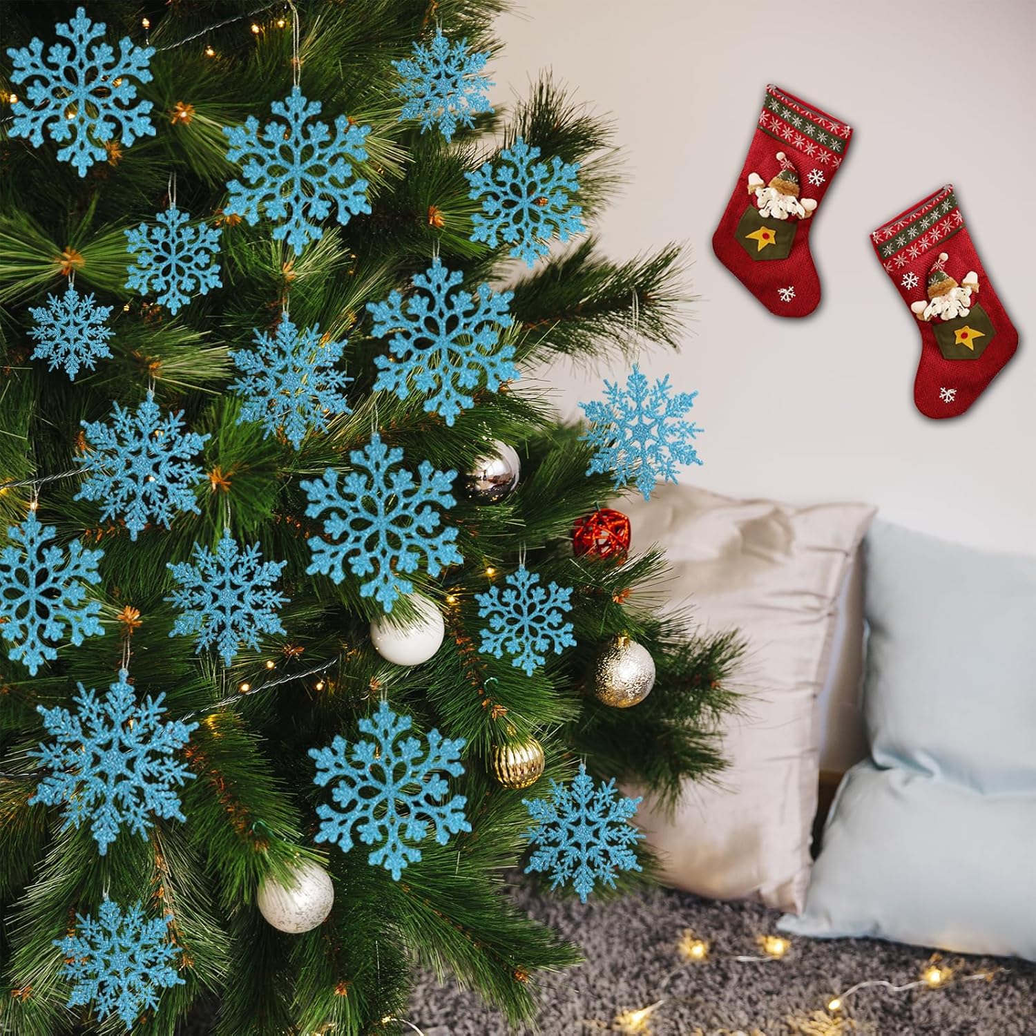 - CHRISTMAS TREE SNOWFLAKES: Featuring sparkly glitters on the surface, these light blue snowflakes tree ornaments add much more sparkle to your Christmas tree decorations, various sizes give a nicer variety on the tree, just let it snow.