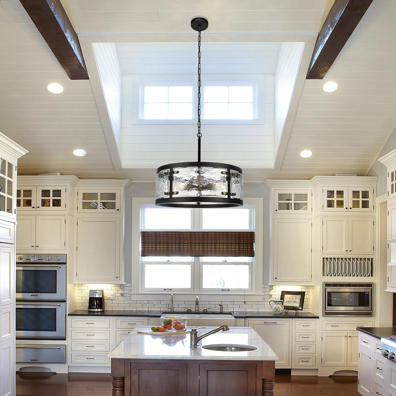 20" Farmhouse Round Black Chandelier, 5-Light Rustic Dining Room Light Fixtures Over Table, Industrial Glass Chandeliers for Dining Kitchen Living Room, Clear Waterglass Drum Shade