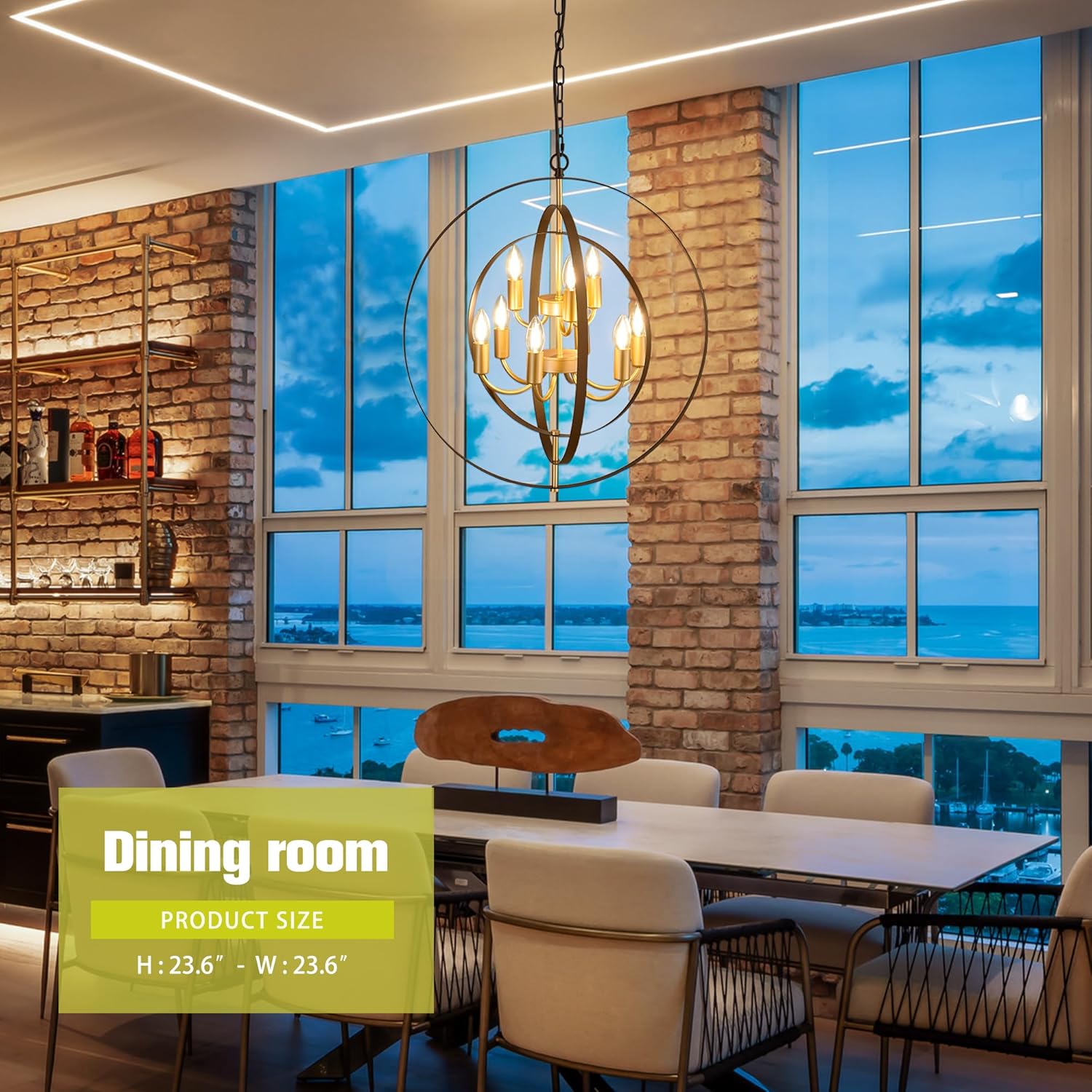 - 【Height Adjustable】This black gold globe chandelier is adaptable for sloped, hanging and flat ceiling. Fixture Dimensions: 23.6" high x 23.6" wide. Equipped with 78.7inch(2m) chain and cord; length can be adjusted according to your preferences and design. Ideal for different areas including the dining room, living room, kitchen, inches.