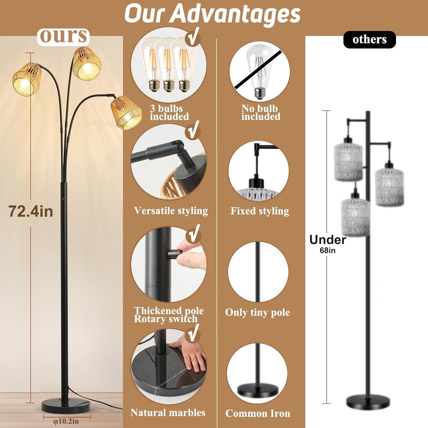 - 【Flexible Design】Our boho floor lamps for living room are designed to cater to any space with their 3 lamp floor lamp rattan structure. The adjustable arms provide focused lighting for a cozy reading corner or broad illumination for social gatherings. This coastal floor lamps for living room adapts to the multifunctionality of your home with refinement and ease