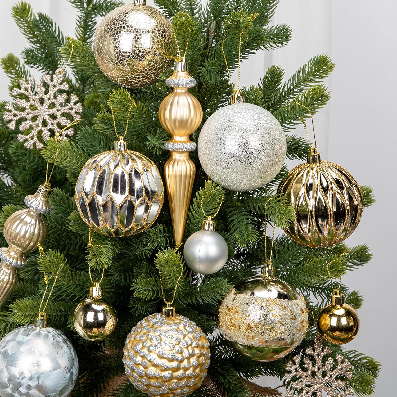 - COMPLETE 92-PIECE SET β Each Christmas ornament set includes 92 carefully selected pieces in various sizes and designs, including classic round balls, intricate finials, glittery snowflakes, and mini baubles. This complete collection allows you to decorate your entire Christmas tree with a perfectly coordinated look